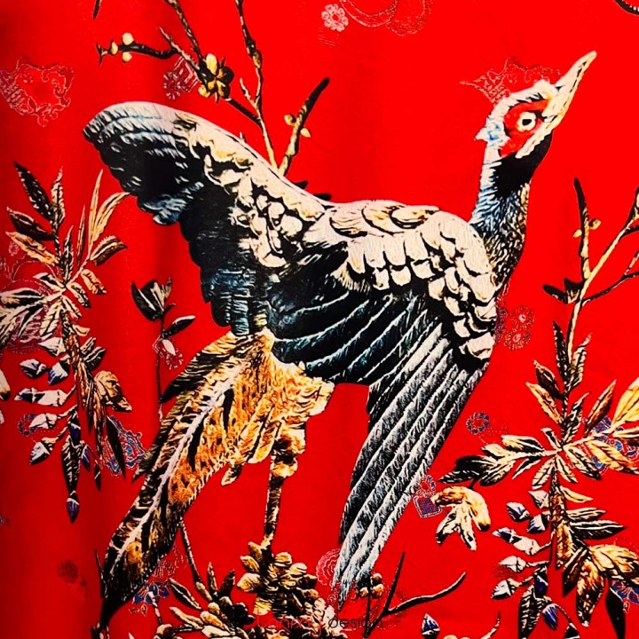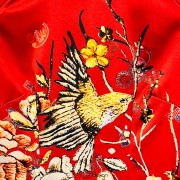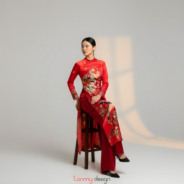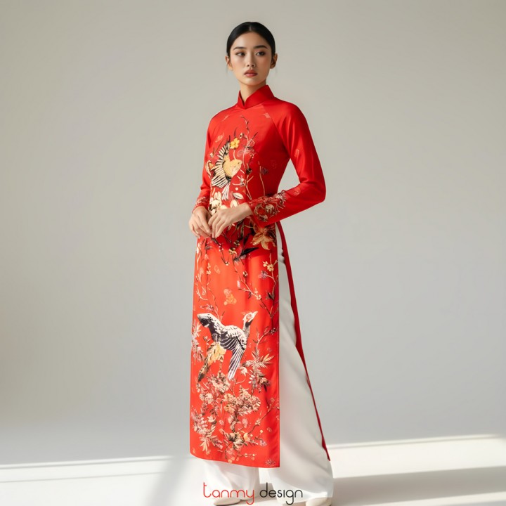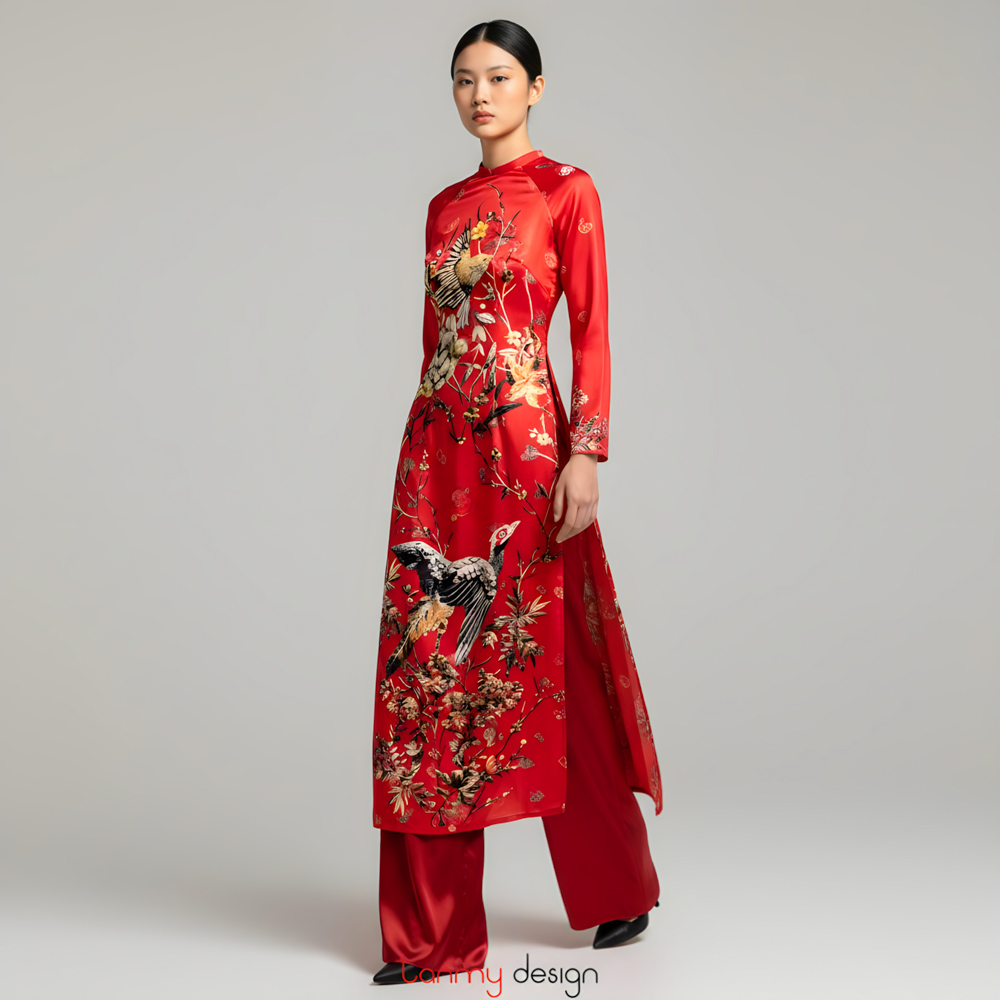 Áo dài lụa in họa tiết hoa lá/chim dài tay đỏ S