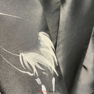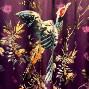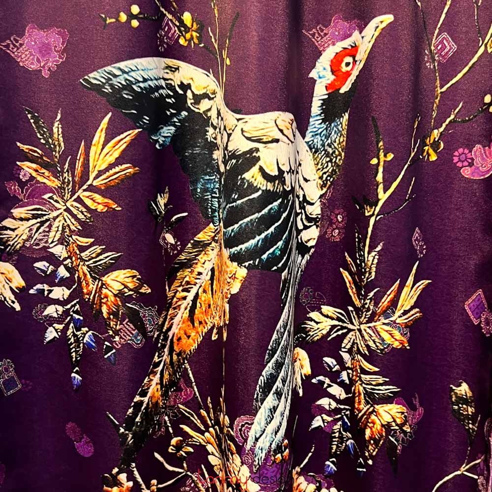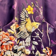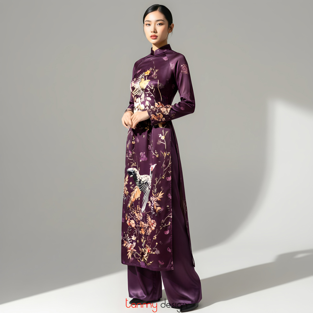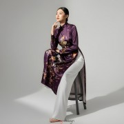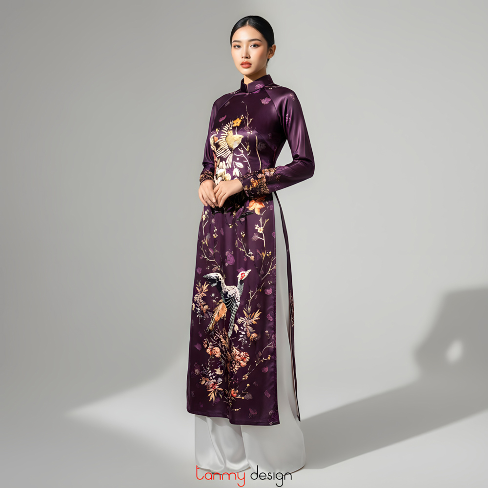 Áo dài lụa in họa tiết hoa lá/chim dài tay tím đậm M
