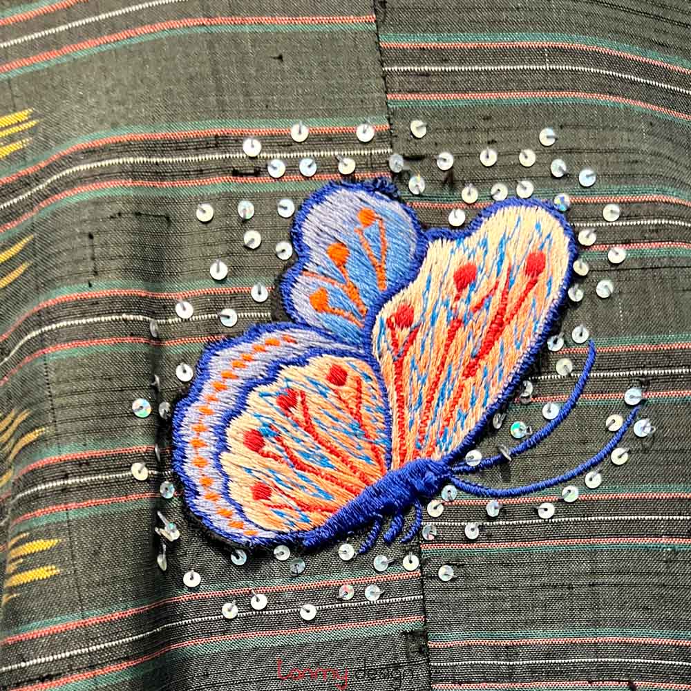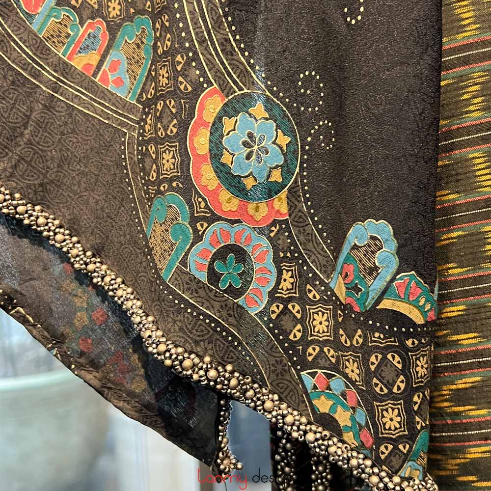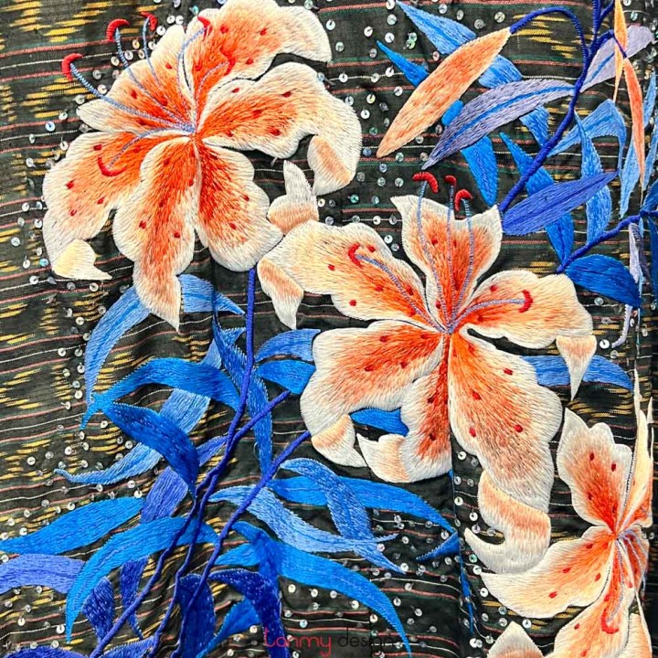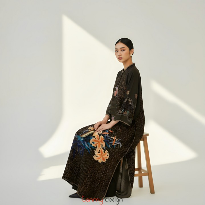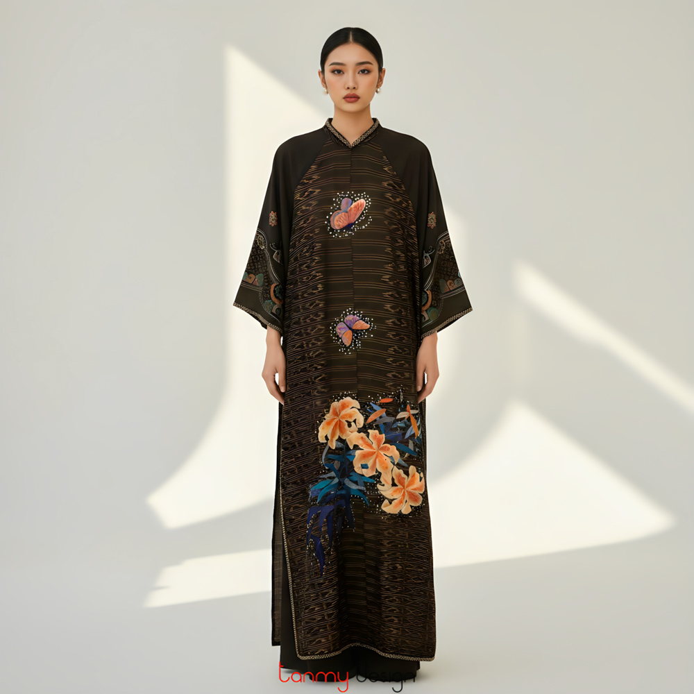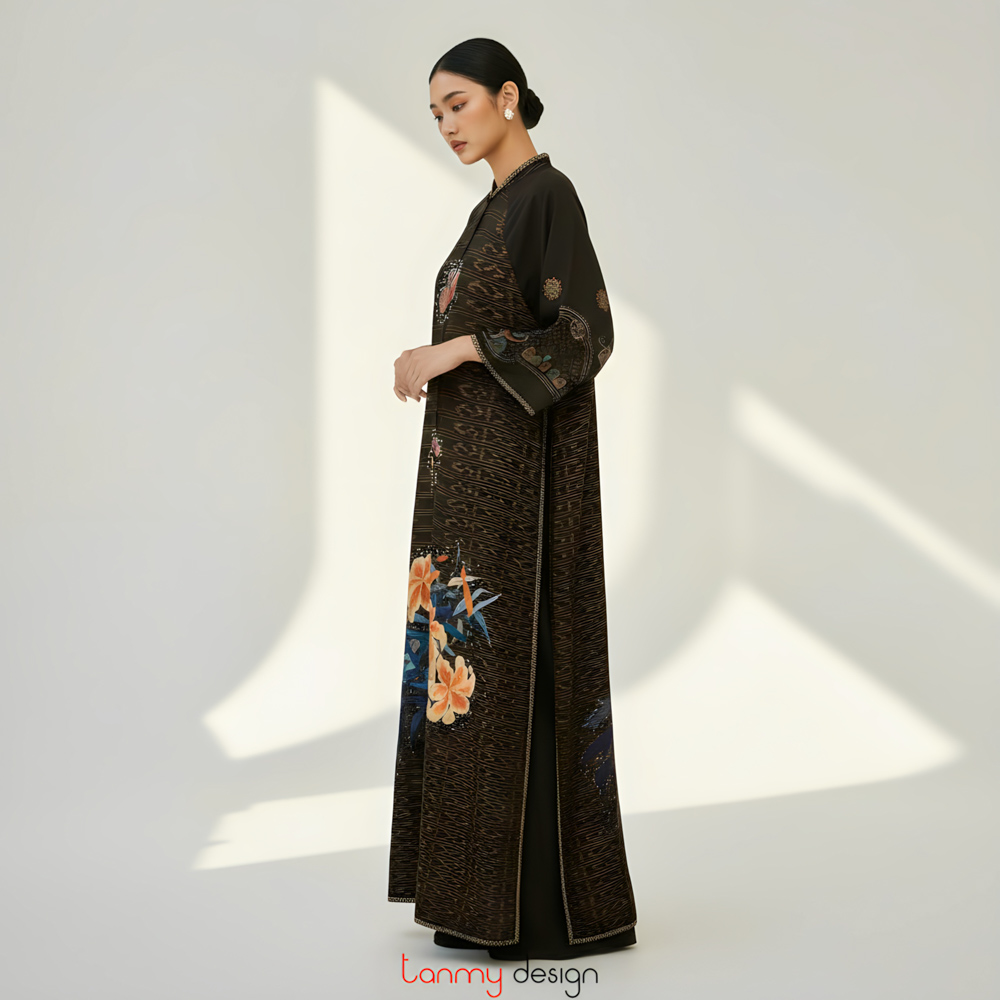 Áo dài lụa thái thêu hoa Ly màu nâu/đen