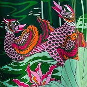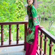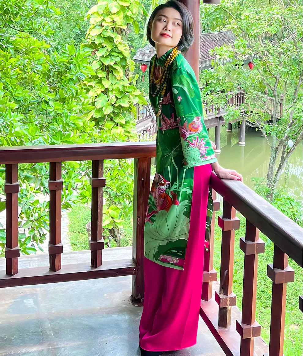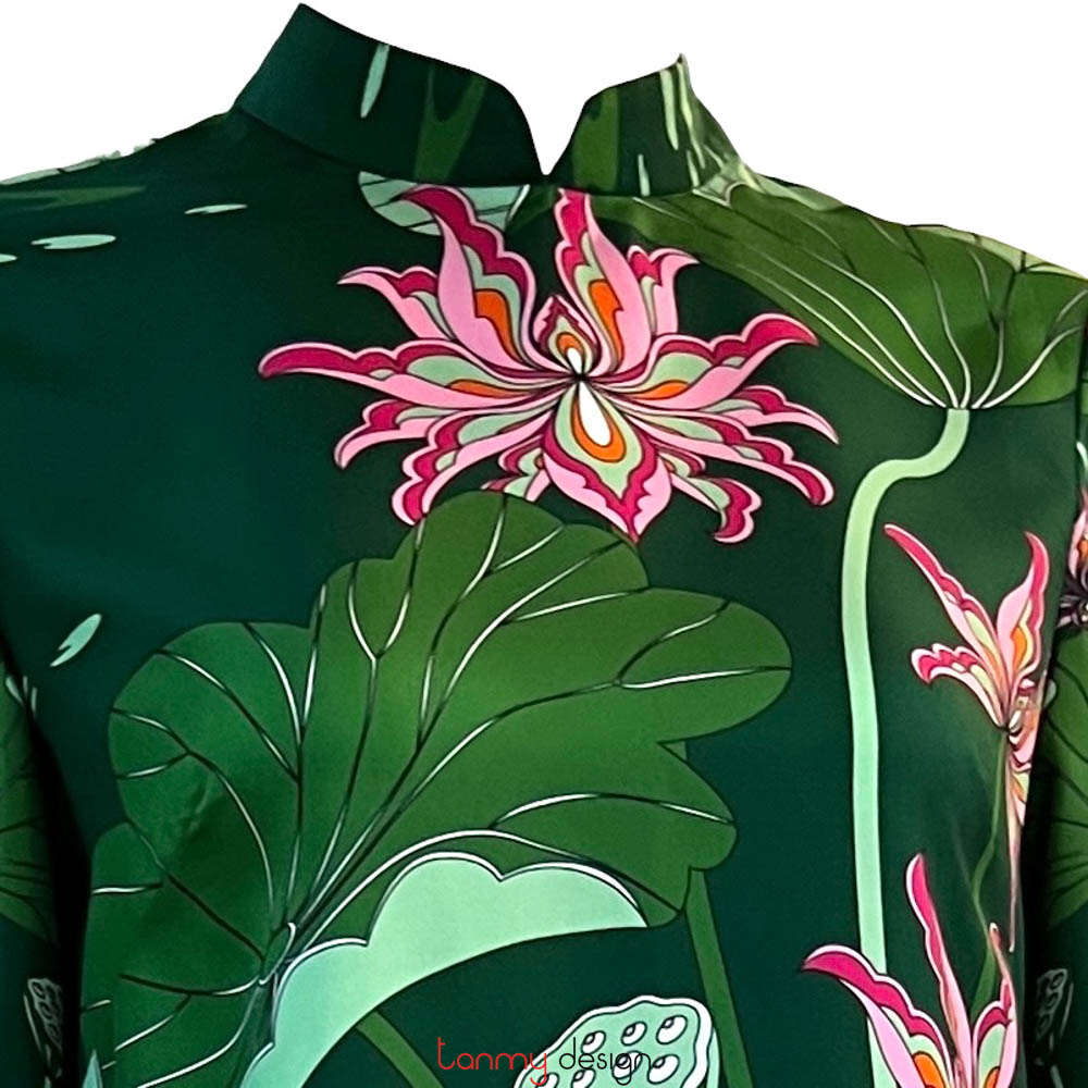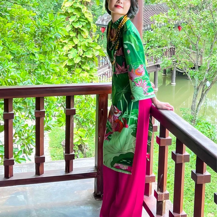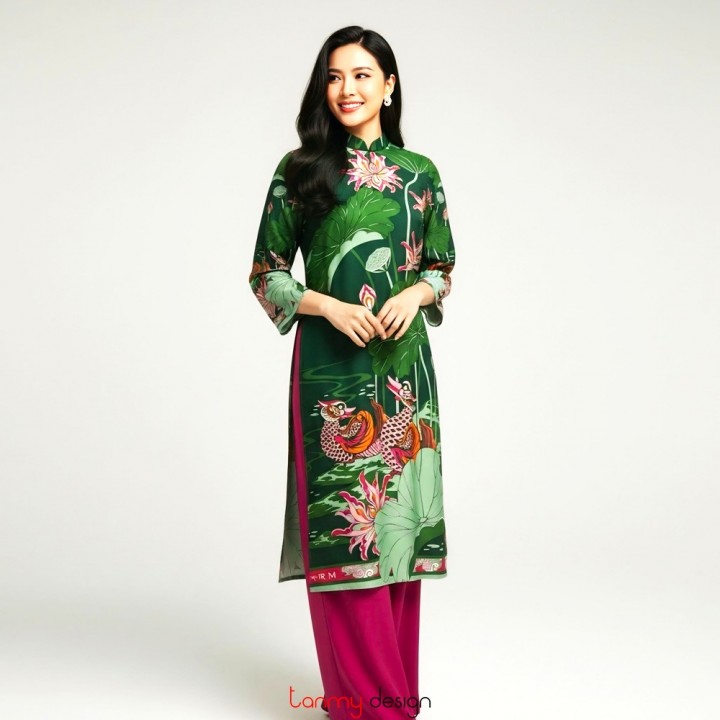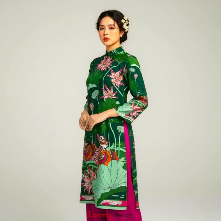 Áo dài tay loa Uyên ương liên hạ xanh hồng F
