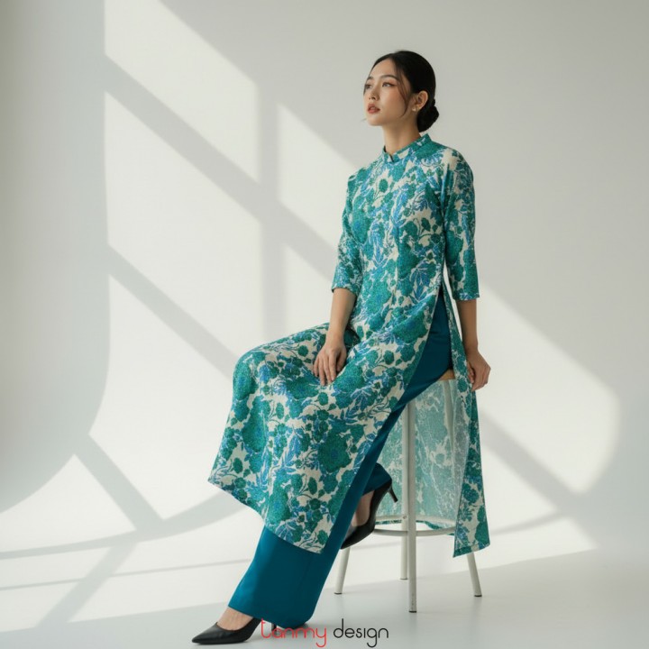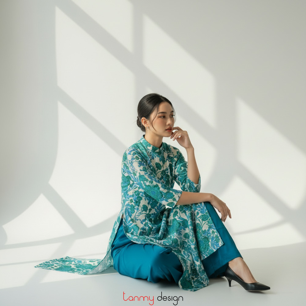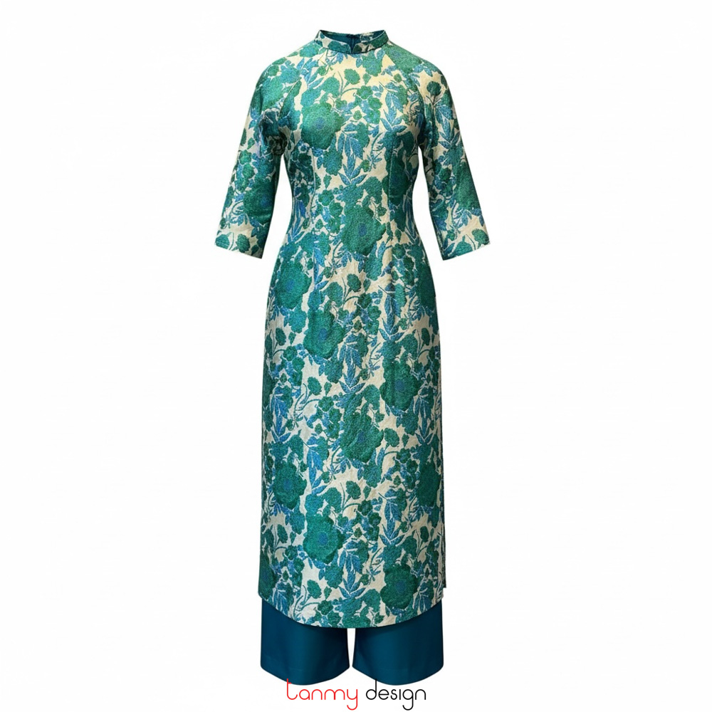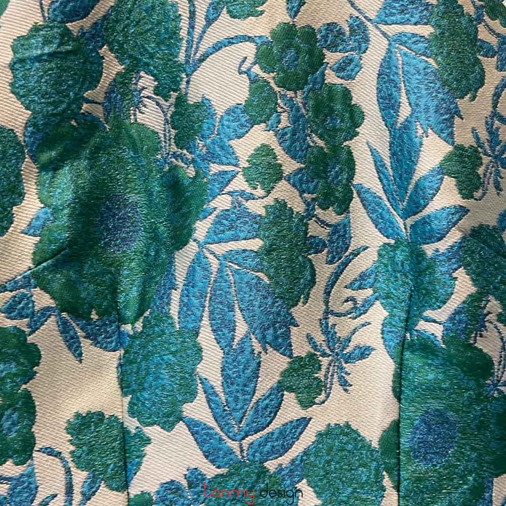 Set Áo Dài Tân Xuân gấm hoa nổi hoa xanh F