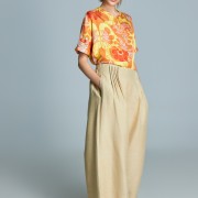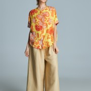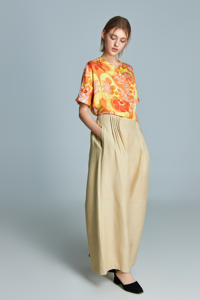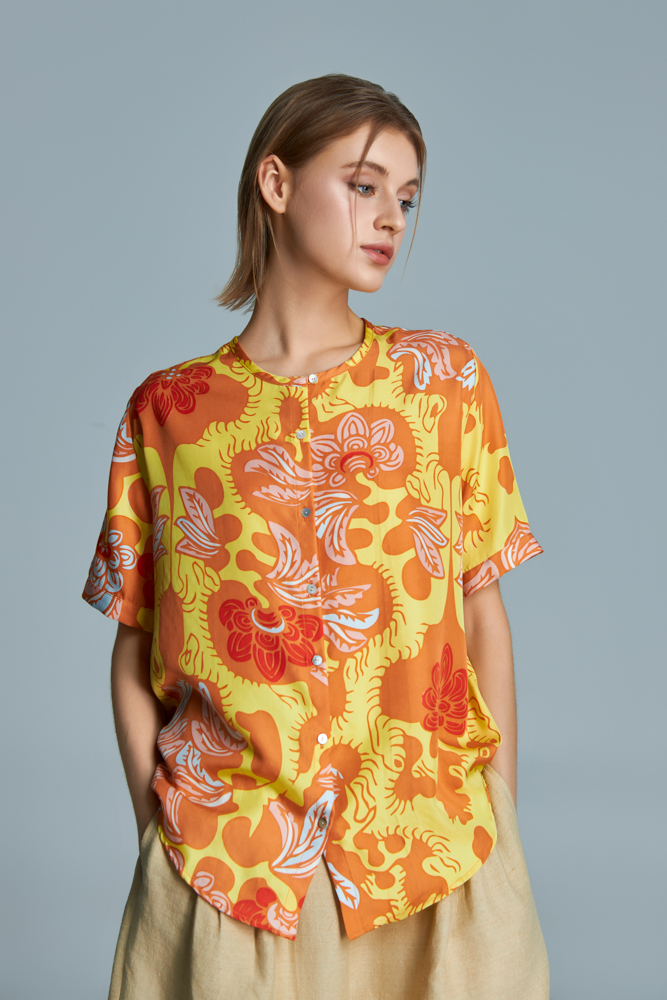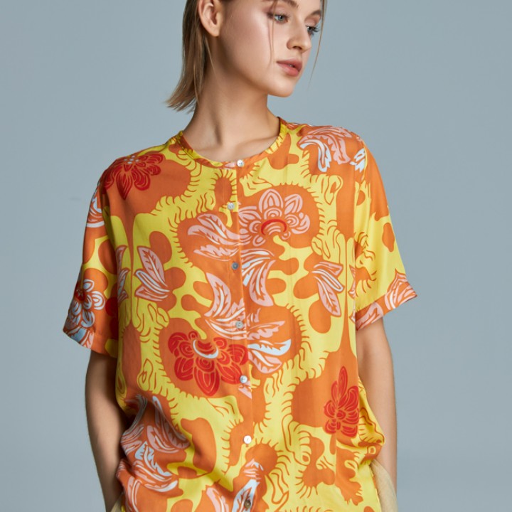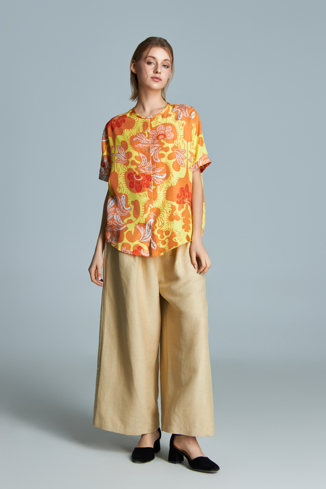Áo sơ mi lụa cổ tròn vàng cam Vườn Thanh xuân