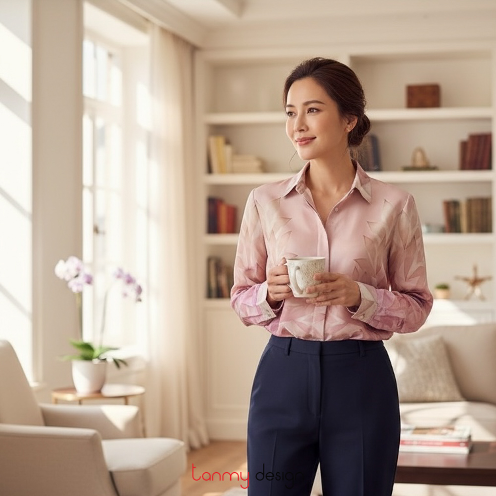 Áo sơ mi lụa dài tay họa tiết hoa sen hồng