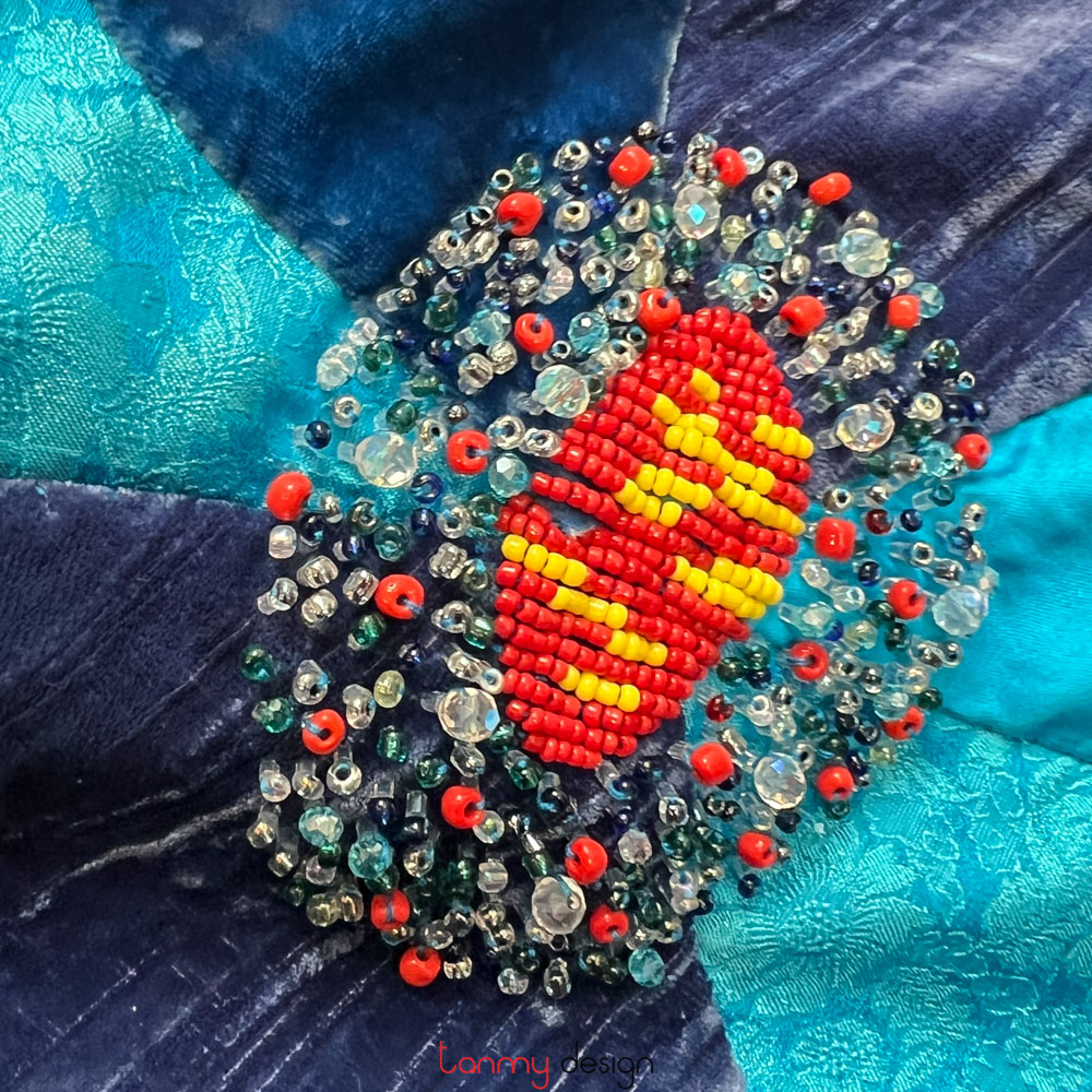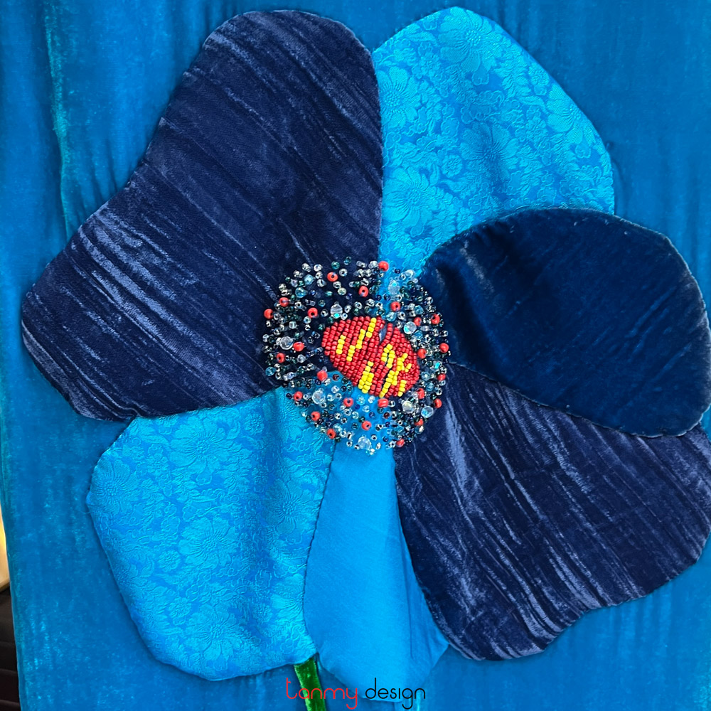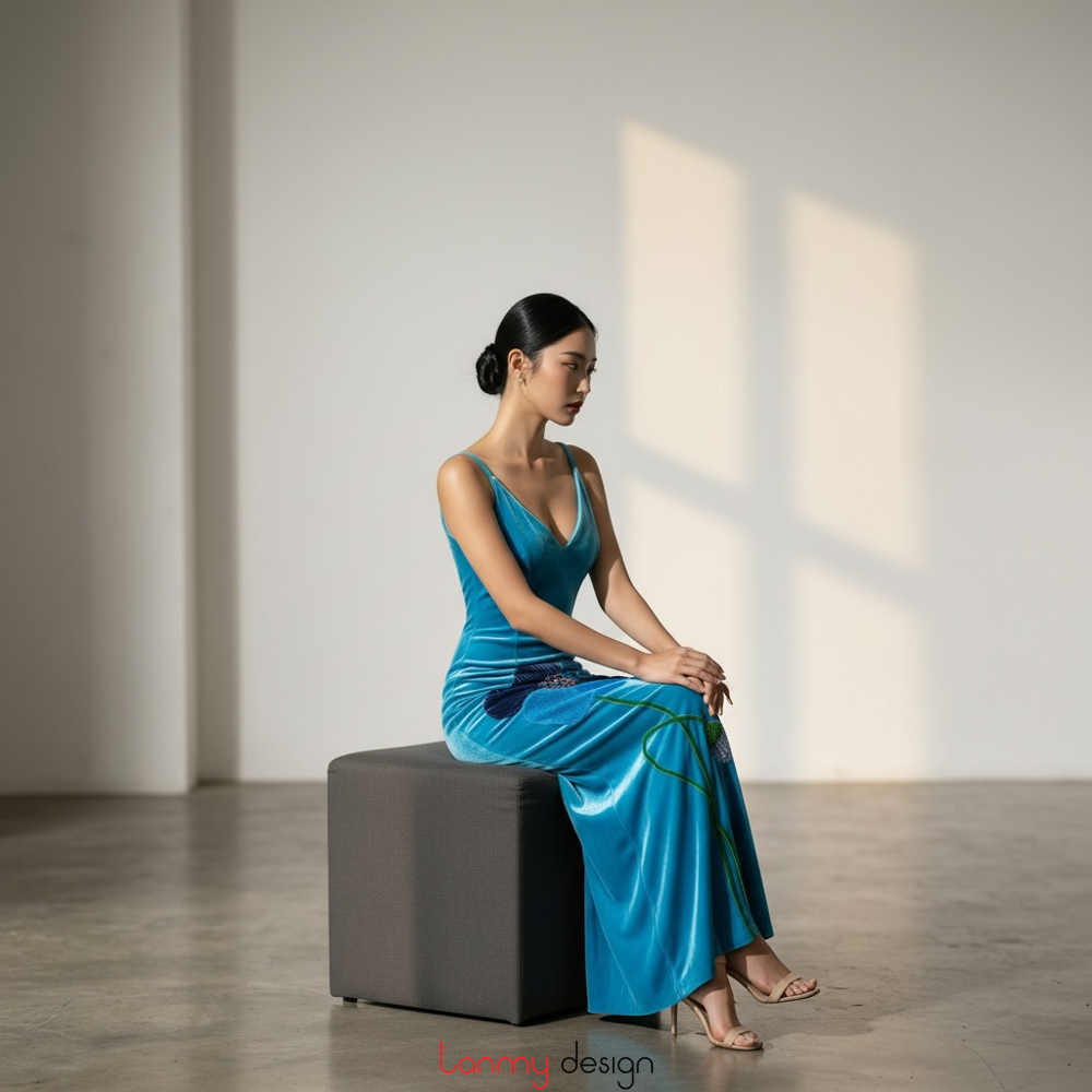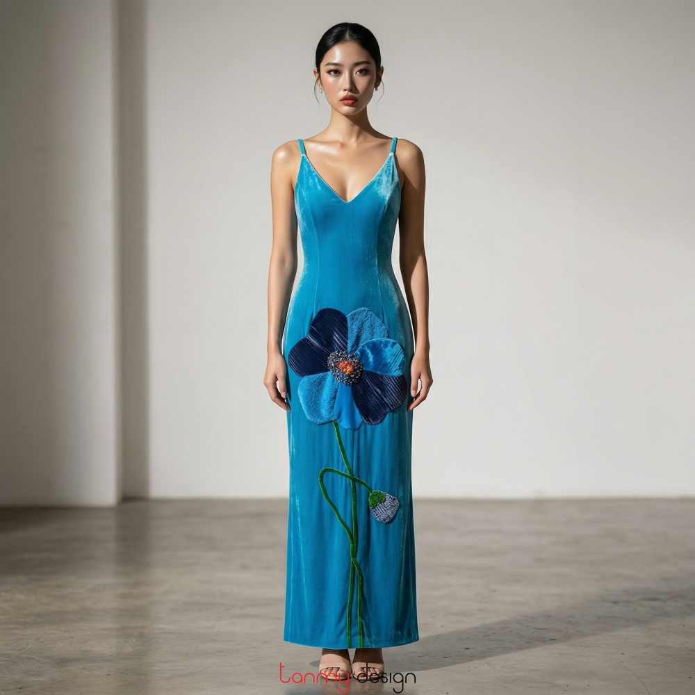 Đầm maxi 2 dây xẻ sườn thêu hoa 3D nhung xanh cobalt