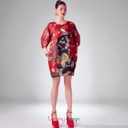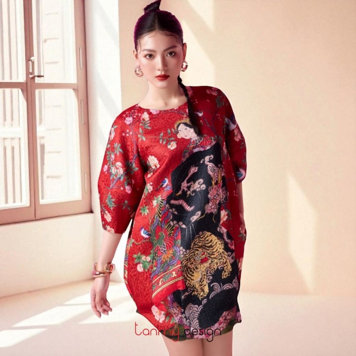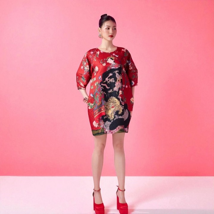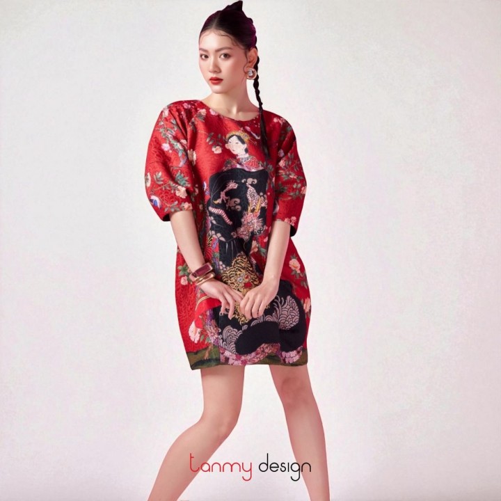 Đầm cocoon tay lồng đèn vải gấm in Phụ Nữ nền đỏ nâu