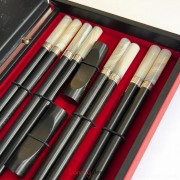Bộ 4 đôi đũa gỗ mun ốc xà cừ tròn bọc bạc kèm hộp cẩn nút đỏ 28*12*4,5cm