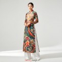 DVMD000934-Copper brown silk Vietnamese long dress with flowers and birds