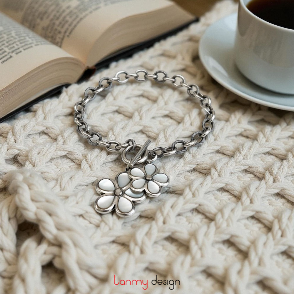 Silver chain bracelet with 2- flower charms, silver-coated shell
