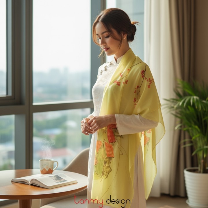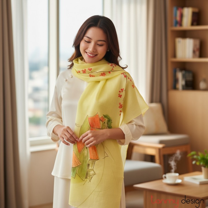 Yellow ramie scarf hand-painted with Old Quarter 70*190cm
