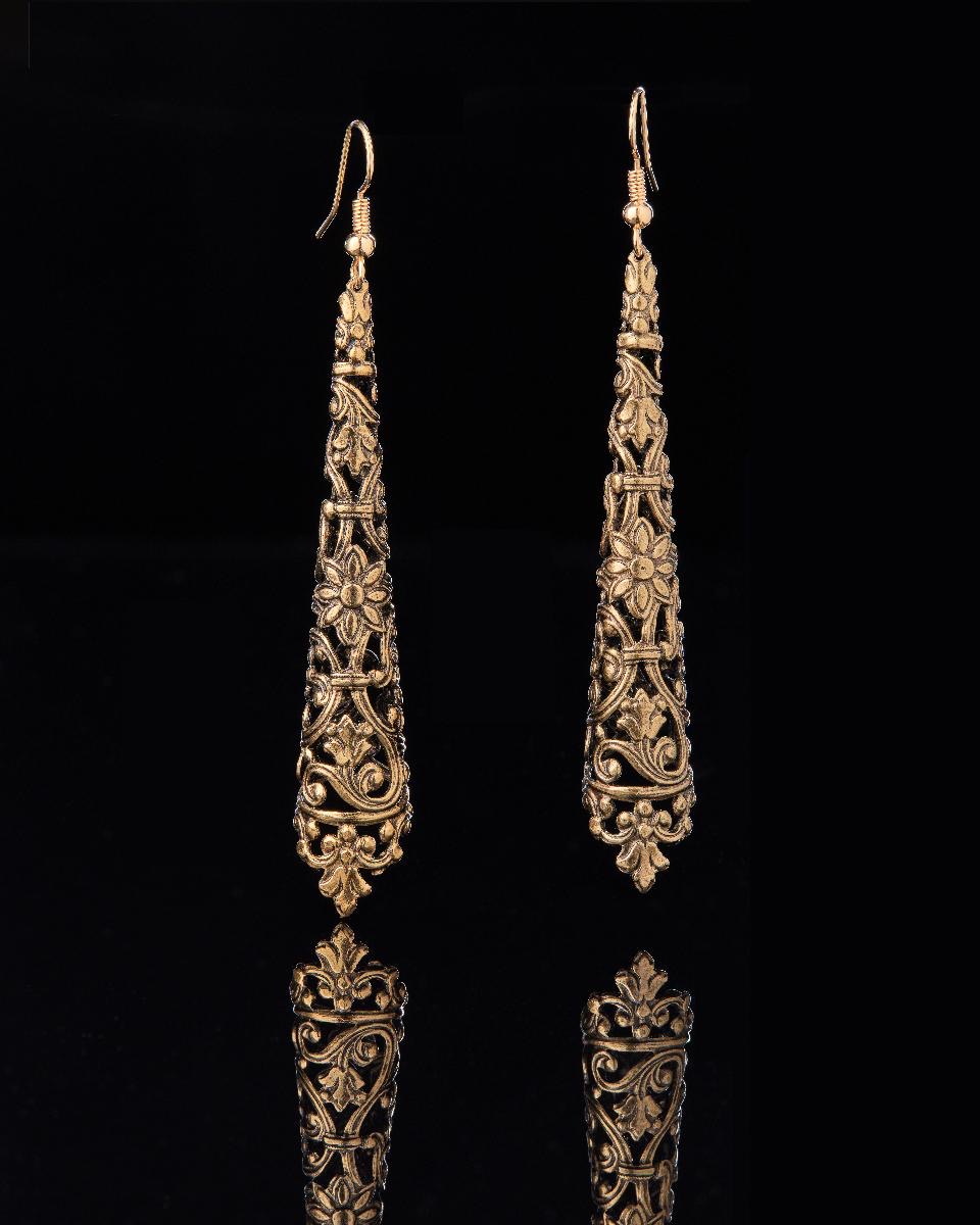 The majority of our jewelry uses stampings: metal patterns, struck on a sheet of brass using a die and a punch, allowing us to obtain refined pieces representing various subjects (leaves, flowers, animals, filigree, Art Deco, Art Nouveau, etc.). Full of history, these stampings are made in France on tools, some of which are hand-engraved and date from the middle of the 19th century. With an eco-responsible design, our jewelry is all gilded with 24k fine gold. All models are assembled by hand in our workshop in Nice and often decorated with fine stones and natural pearls.