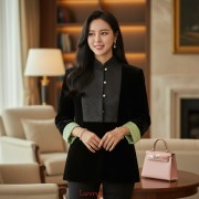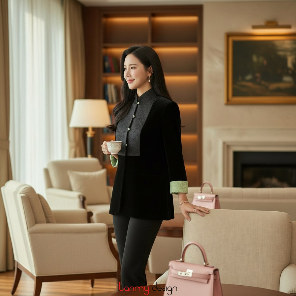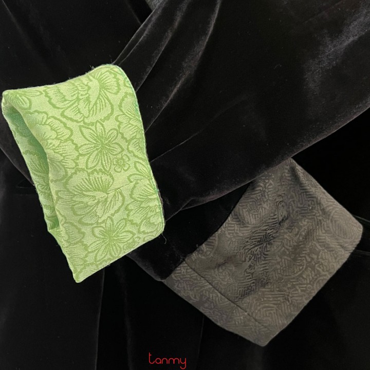 Velvet coat with trapezoid-shaped chest panel, lined with green brocade