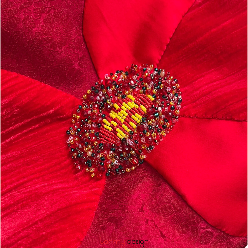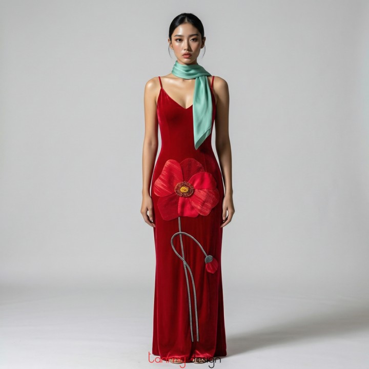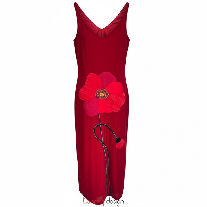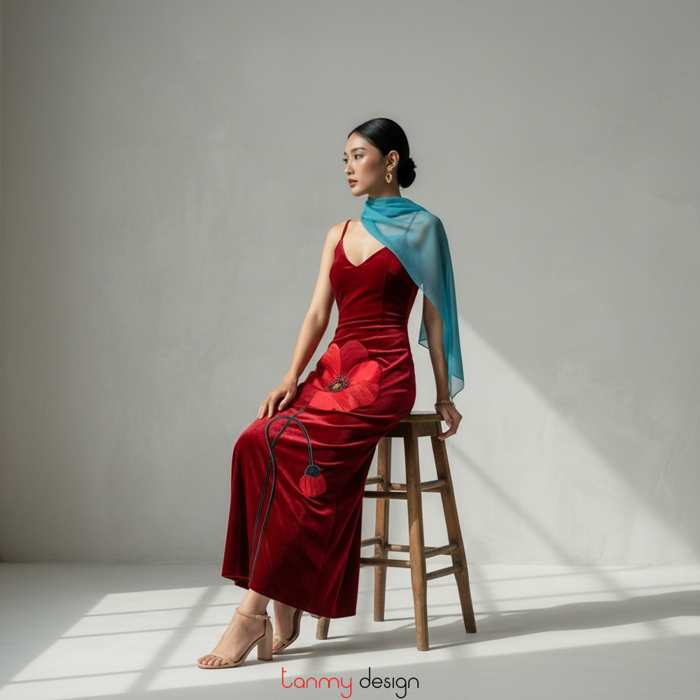 Maxi dress with V-neck front and back, 3D floral embroidery in red velvet