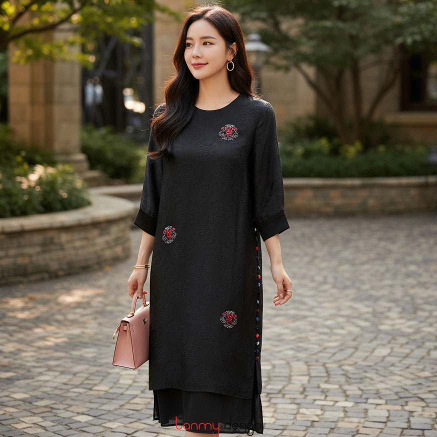 Two-layer silk dress with black longevity embroidery
