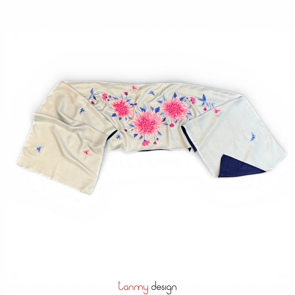 Blue silk scarf hand-embroidered with pink flowers 40*200 cm-Different models