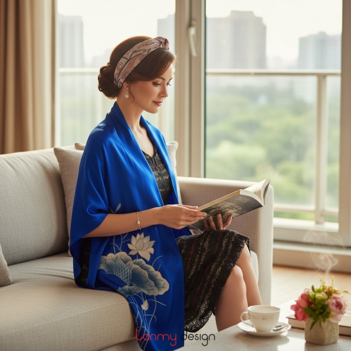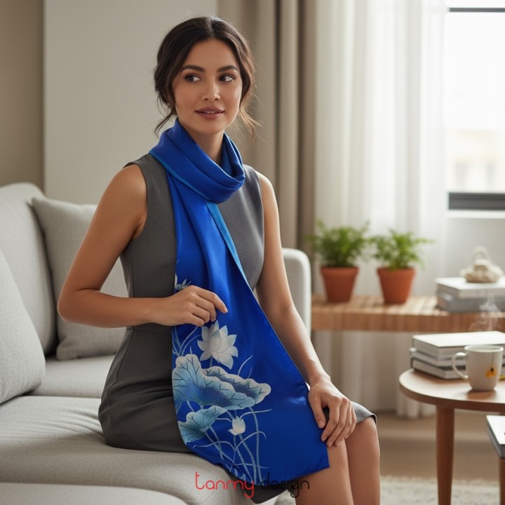 Cobalt blue silk scarf hand-embroidered with lotus 40*200 cm-Different models