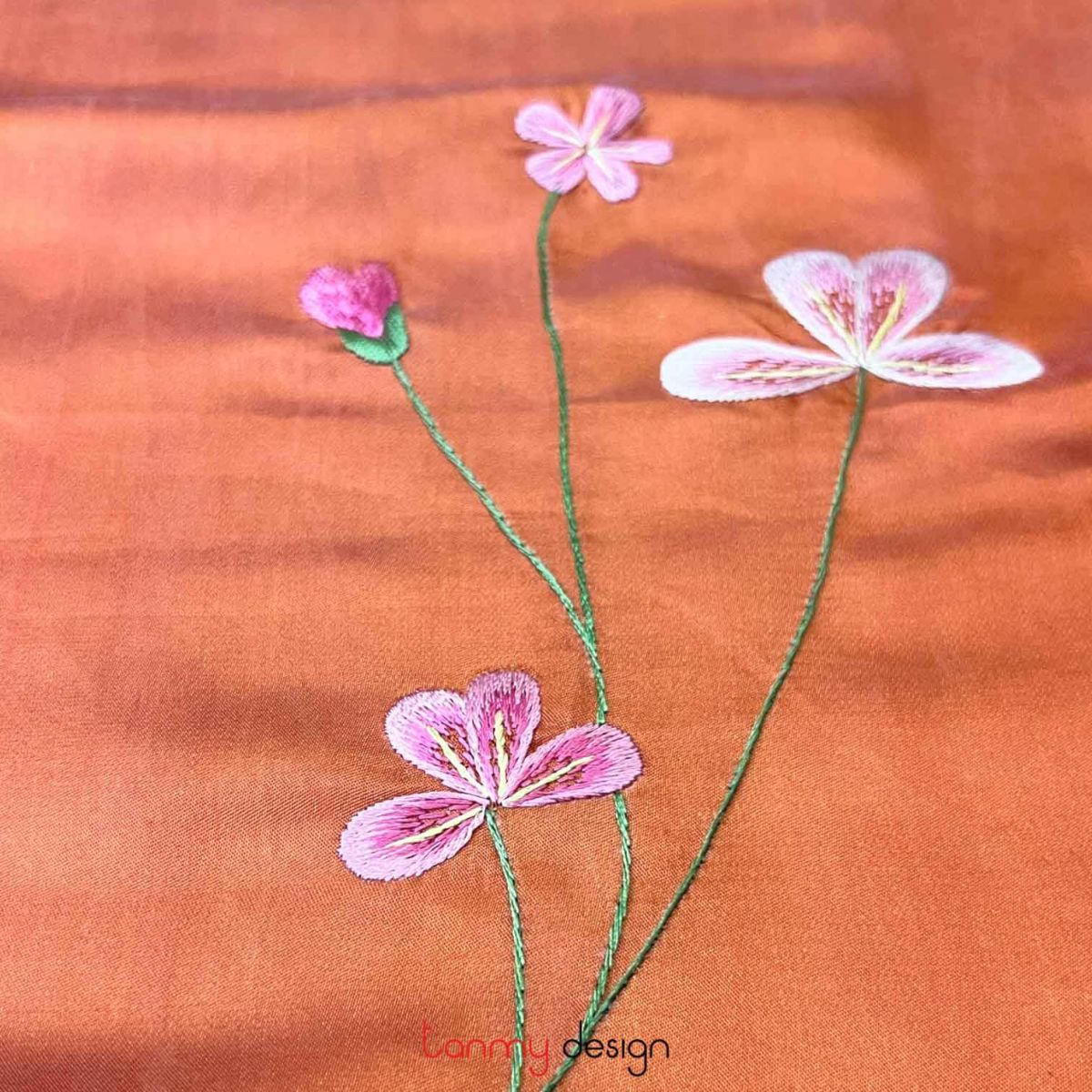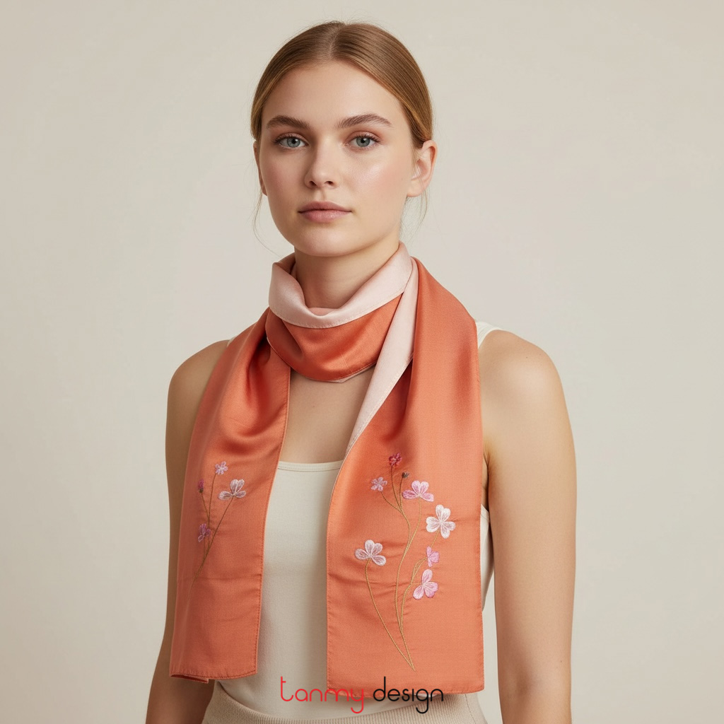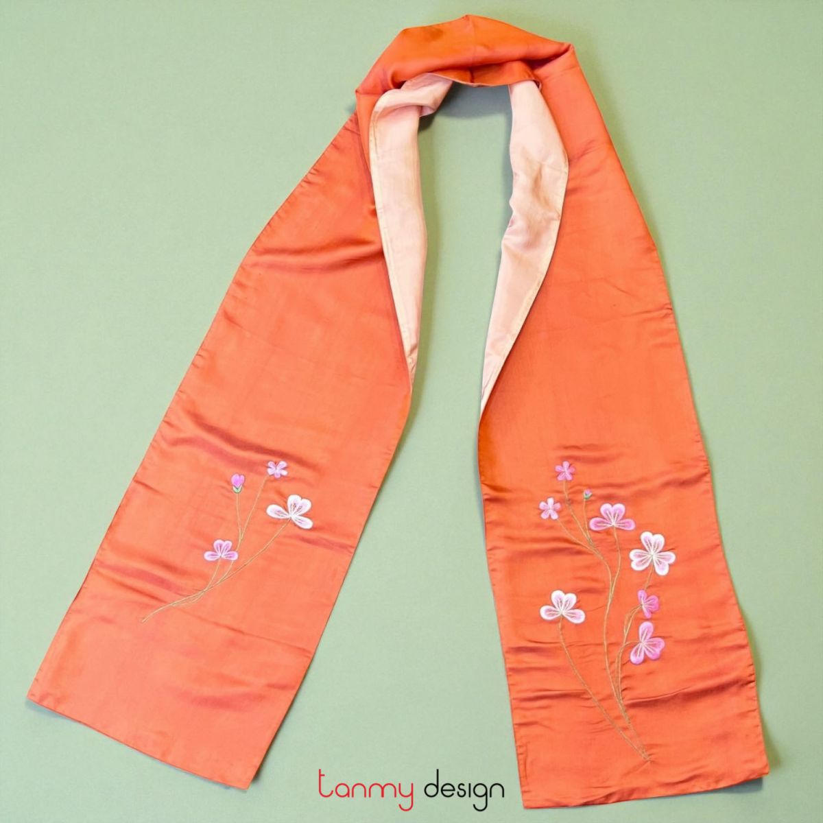 Orange silk scarf hand-embroidered with flower 25*200 cm- Style 6