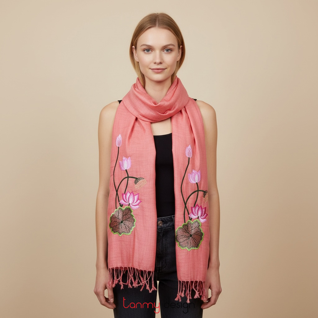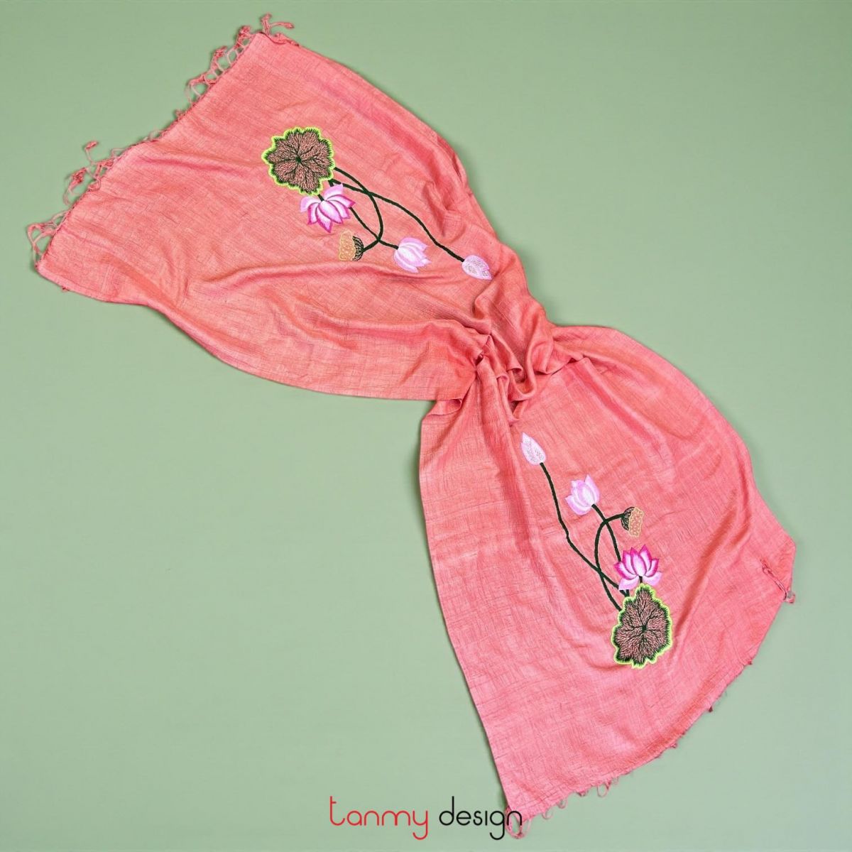 Pink orange silk scarf hand-embroidered with the lotus 190x85cm