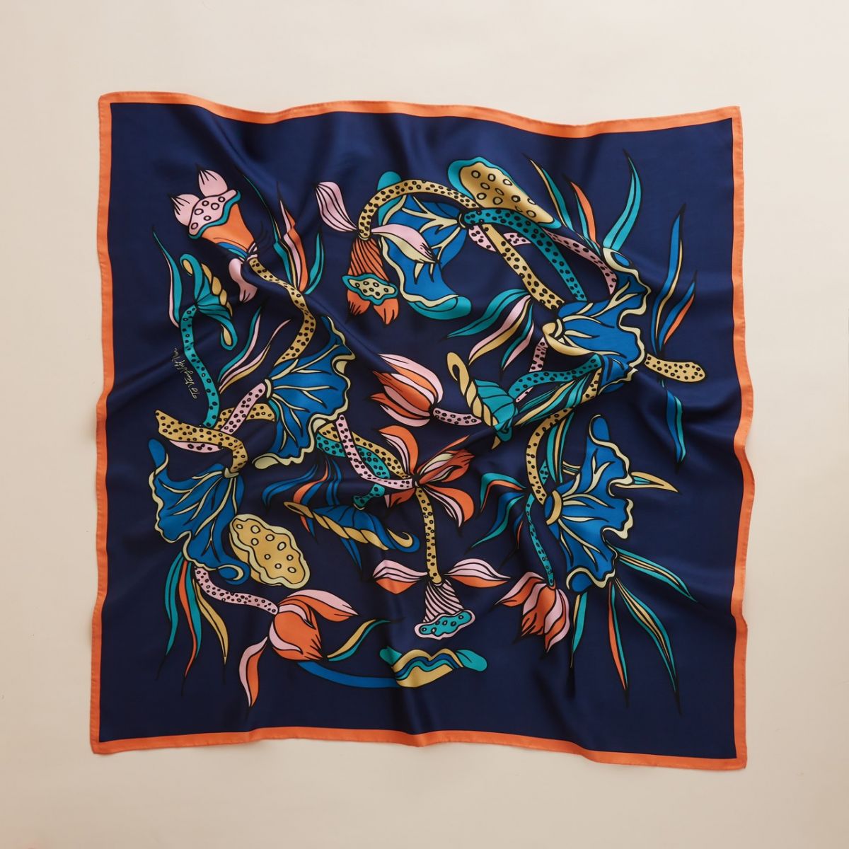 Navy silk scarf printed with lotus ( Liên hoa vũ scarf )