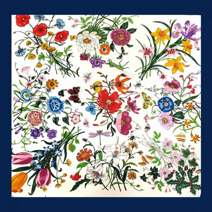 Square silk scarf with wild flower pattern and navy blue border