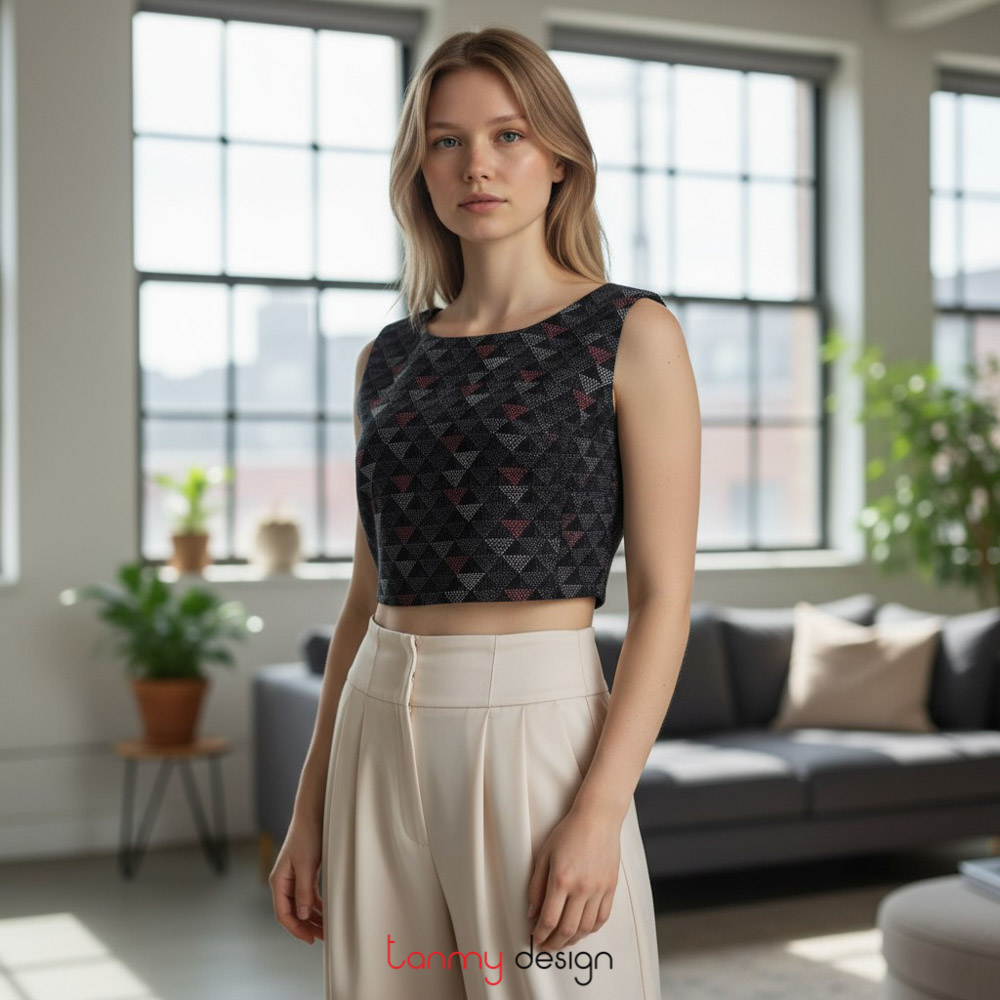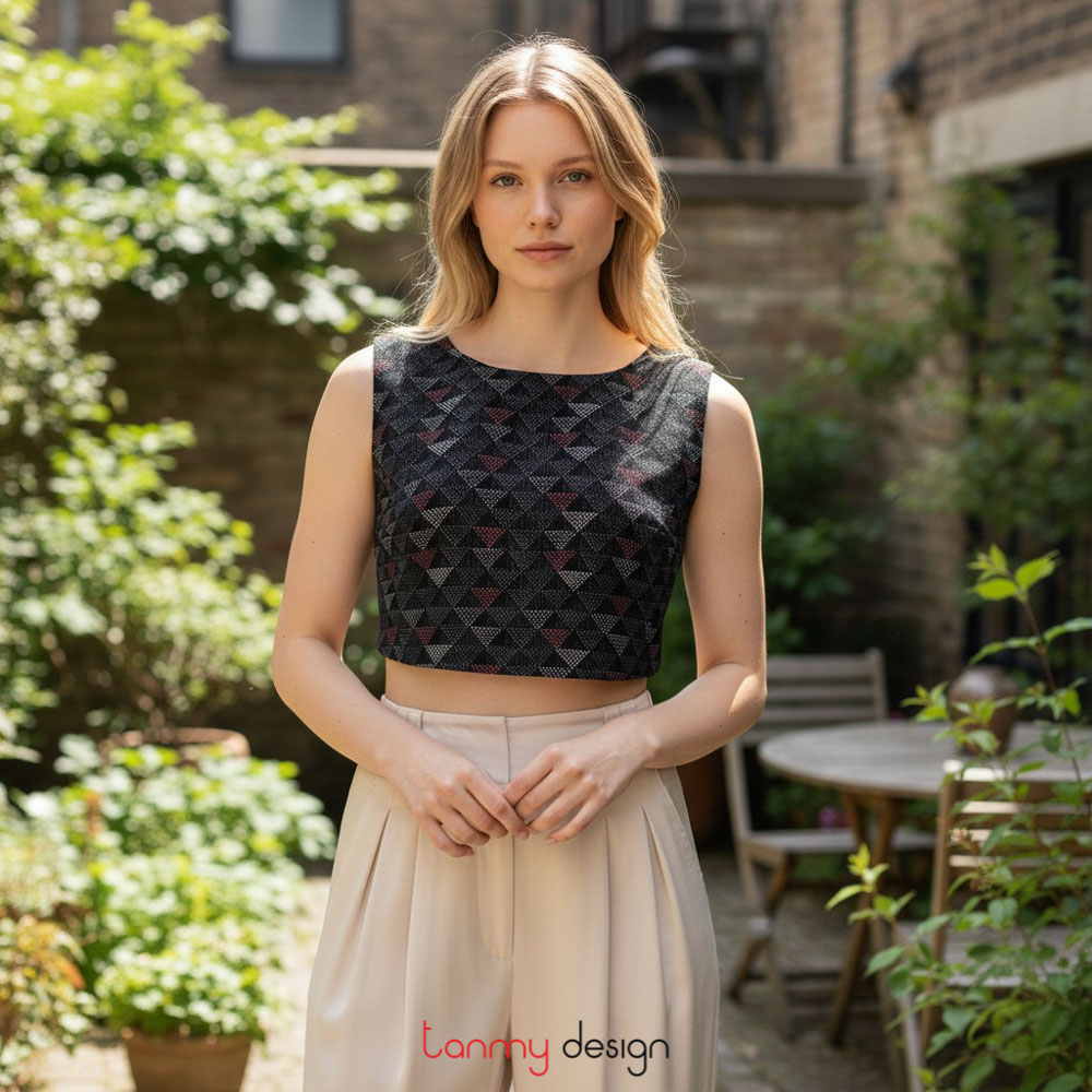 A versatile crop top that can be worn under a blouse or jacket, or simply on its own. It features a round neck, minimalist design, and an open back with adjustable tie closure. Fully lined.