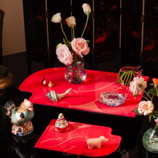 Her lacquer is made in the traditional method with more than 20 layers, all made by skilled artisans in Viet Nam. She uses many natural materials including: eggshell, mother of pearl, buffalo horn, snail shell.