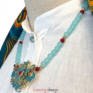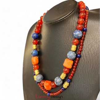 Necklace designed with blue and orange African stone, agate, gold plated metal