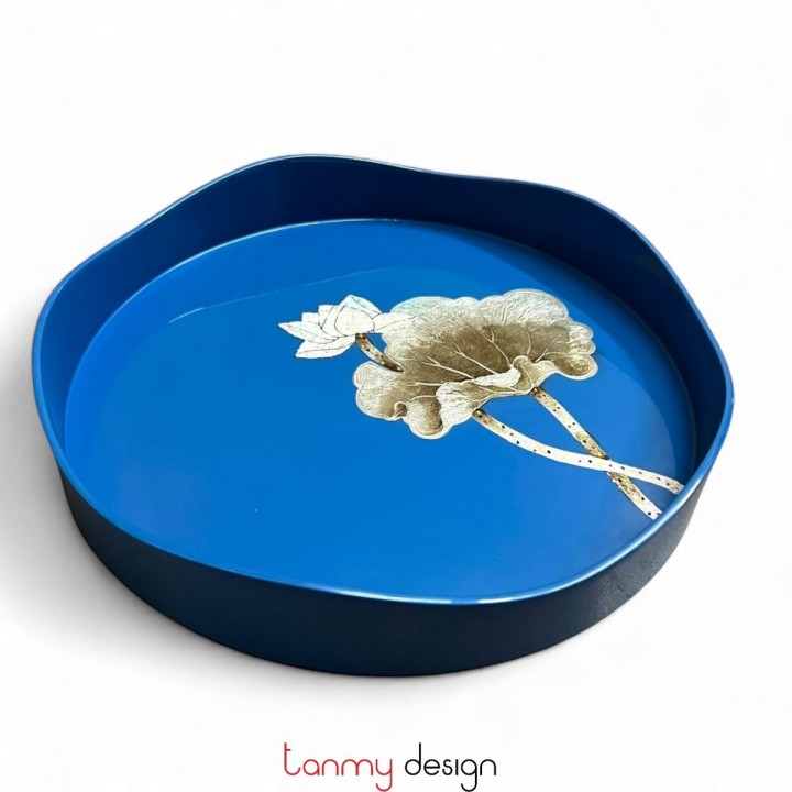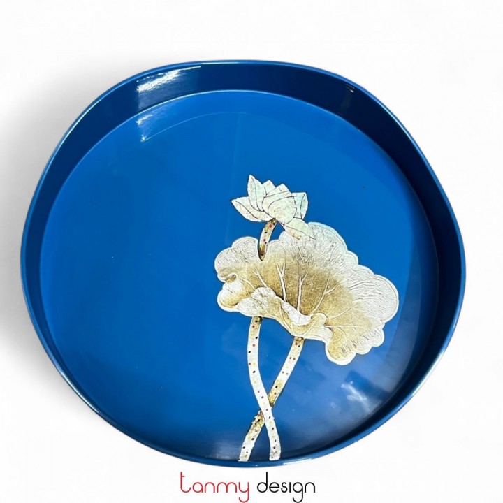 Blue round lacquer tray hand-painted with eggshell lotus 27cm