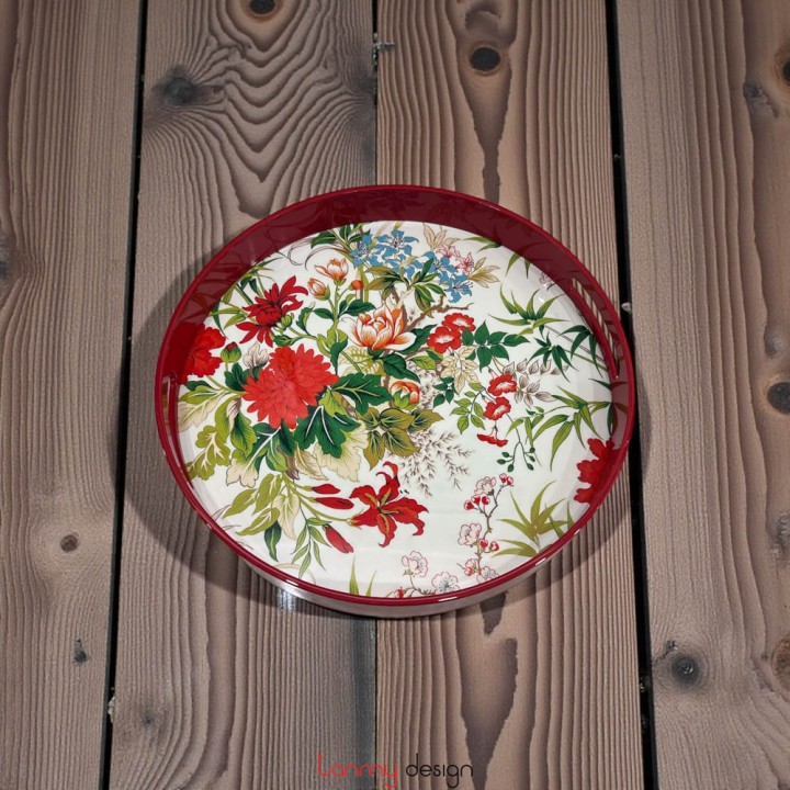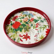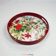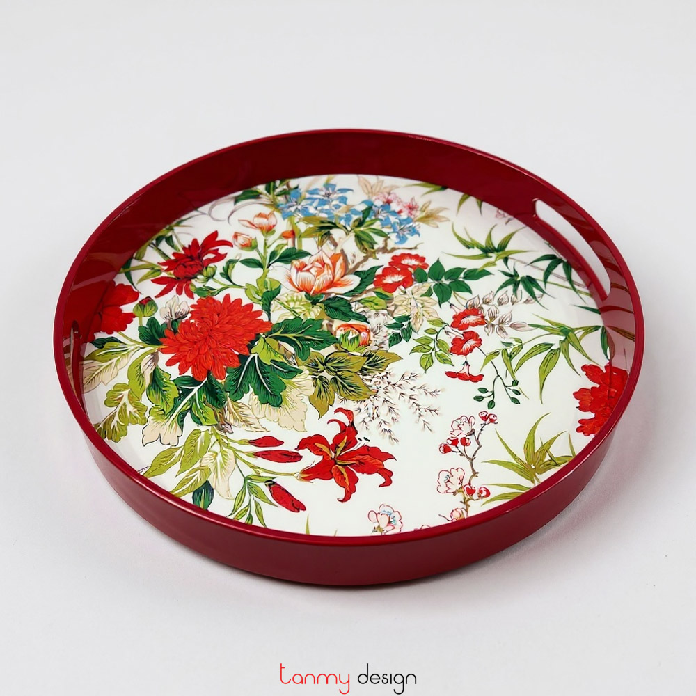 Flower painted round lacquer tray with red handles 40 cm