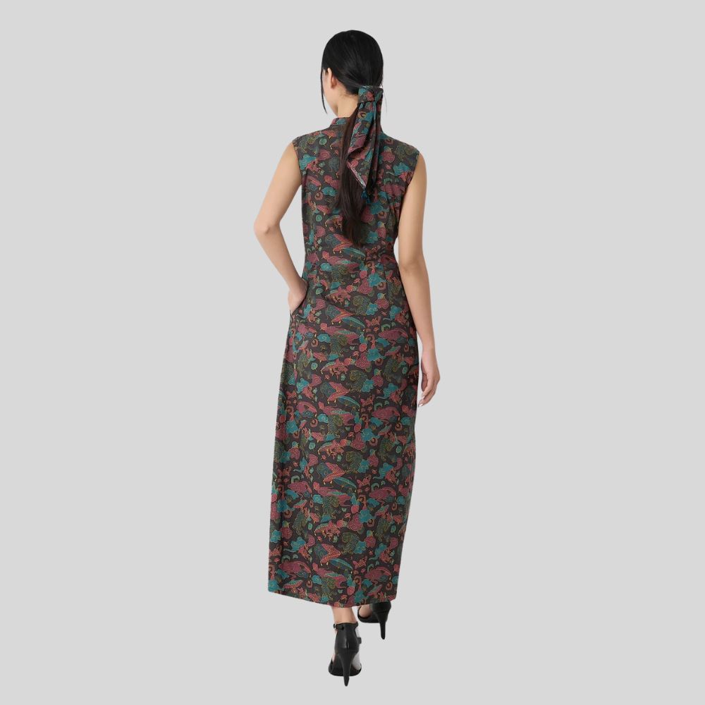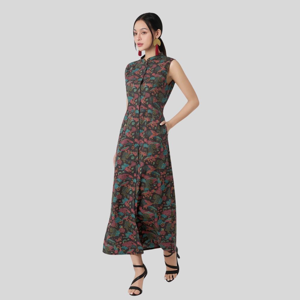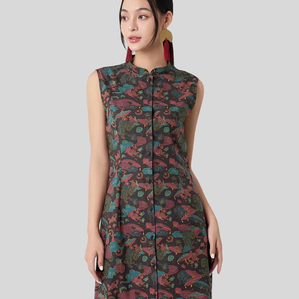 A midi-length dress inspired by the classic Vietnamese ao dai. The sleeveless design and small Mao collar whisper tradition, while the raglan sleeves and fully buttoned front offer a contemporary flair. Flowing side slits add grace to every step, and the adjustable button opening lets you switch seamlessly between a chic, classic look and a daring, trendy vibe.