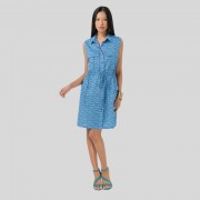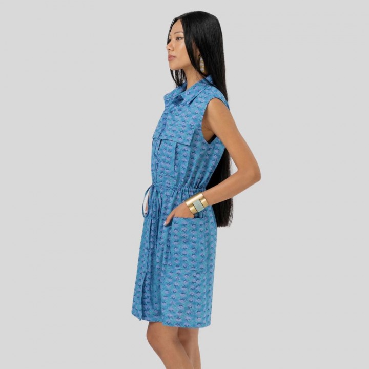 A sleeveless safari shirt dress crafted for the modern adventurer, featuring two chest cargo pockets and two side patch pockets. The classic collar and fully buttoned front are complemented by an adjusted drawstring at the waist, offering a tailored silhouette. Above-the-knee length and comfortable armholes meet a back pleat for ease of movement.