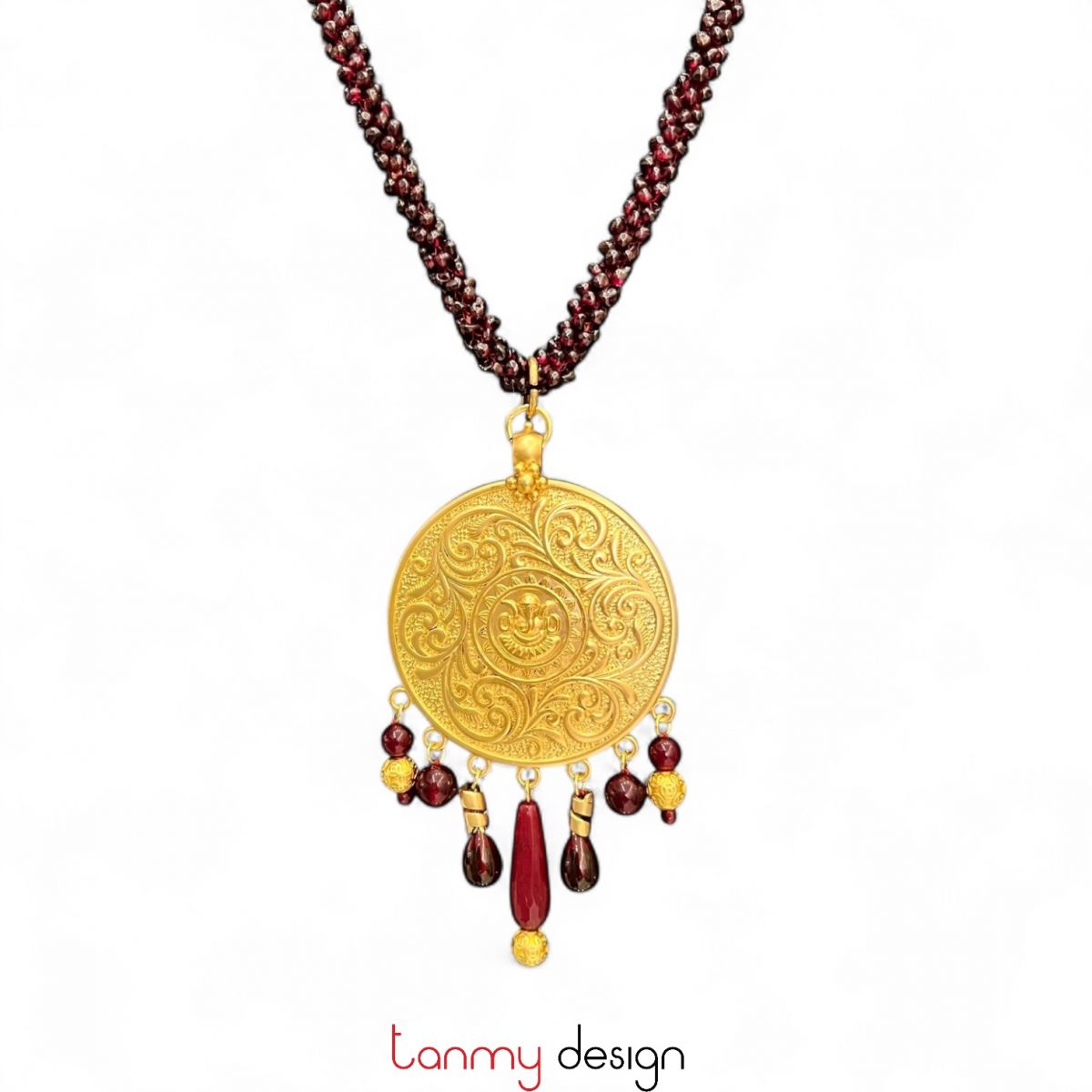 Necklace designed with Garnet, round gold metal Pendant and glass teardrop beads