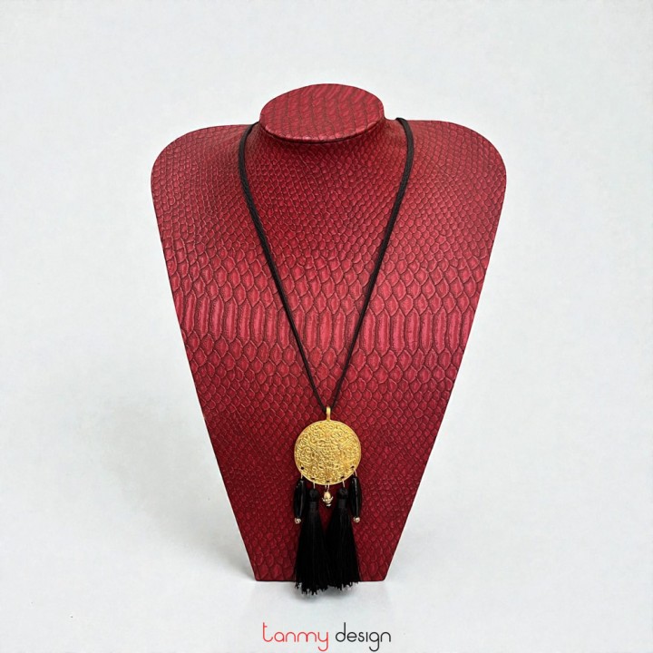 Necklace designed with old-plated metal, black tassels and the black teardrop-shaped agate