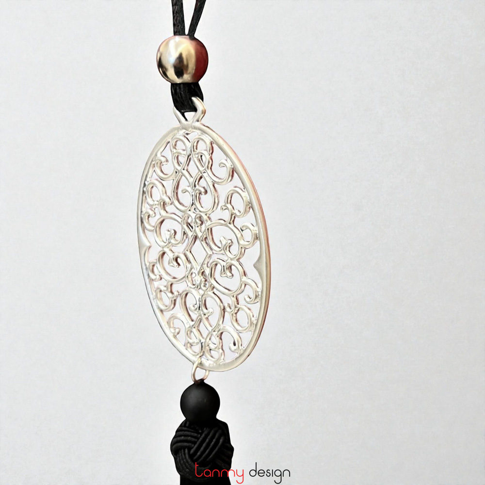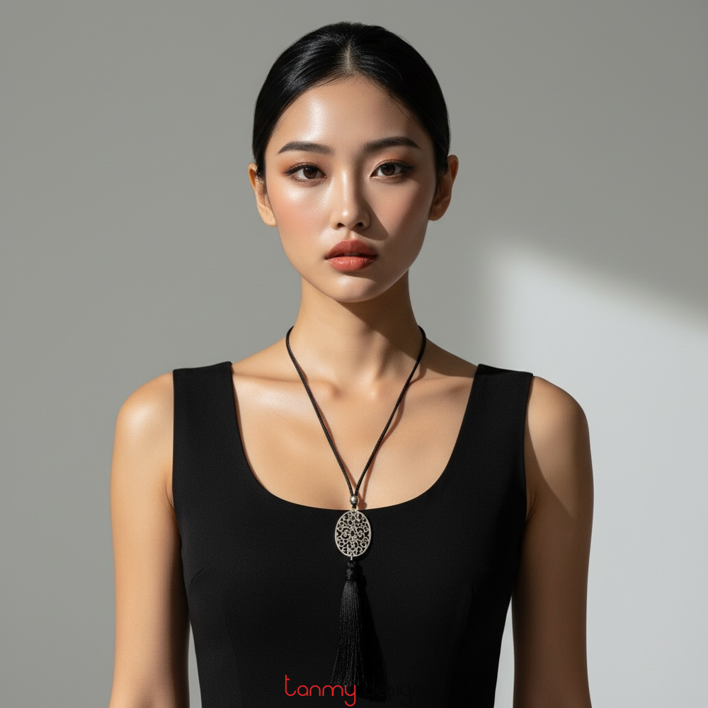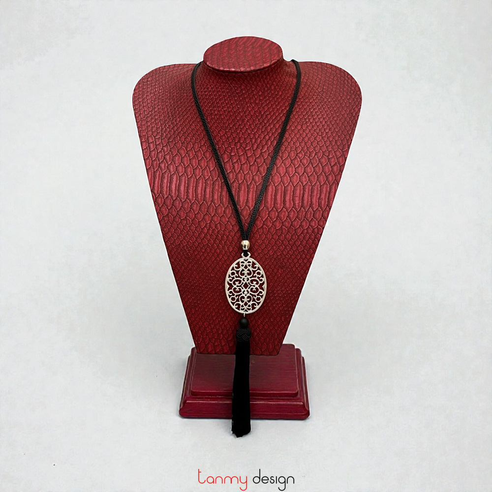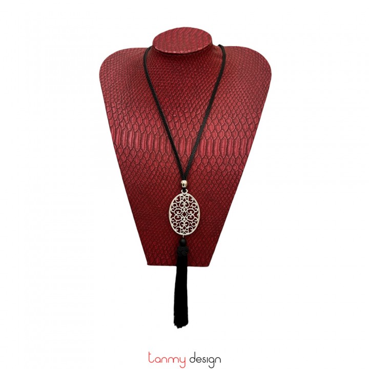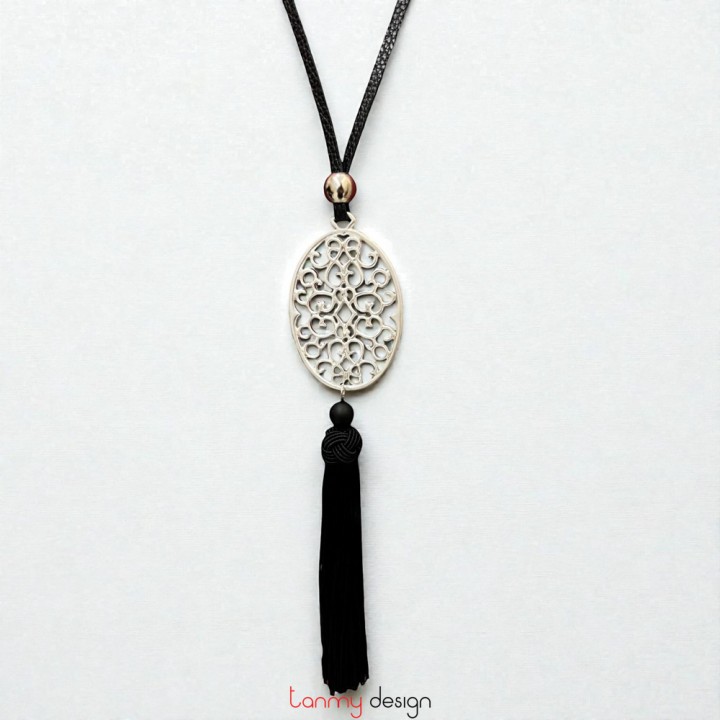 Silver-plated metal necklace with black tassels