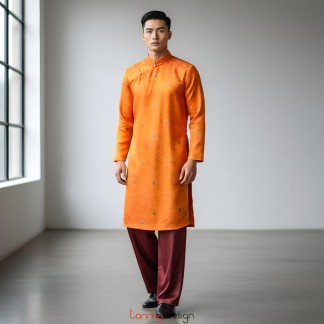Men-s traditional Vietnamese long tunic in yellow printed fabric