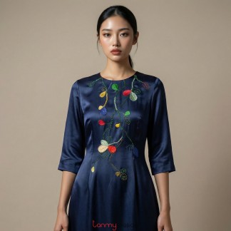 Dark navy silk dress embroidered with tropical almond leaves