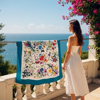 Square silk scarf with wild flower pattern and turquoise border