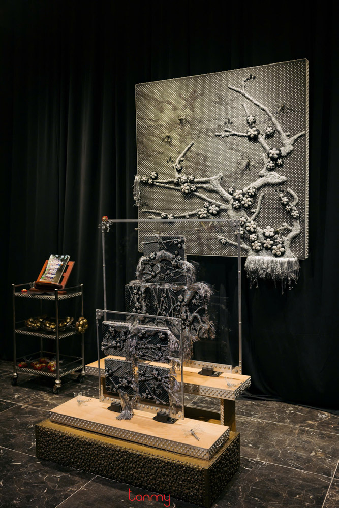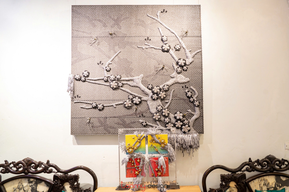The vitality of creation and the harmony of the five elements (Ngũ Hành) are conveyed in Mai’s works through a symphony of colors and textures: the white of silver, the golden hues of brass, delicate gold leaf meticulously gilded onto hand-cast apricot blossoms, and the shimmering reds, yellows, and blues of dragonfly wings in flight. These elements paint a world uniquely her own. Alongside the masterful
