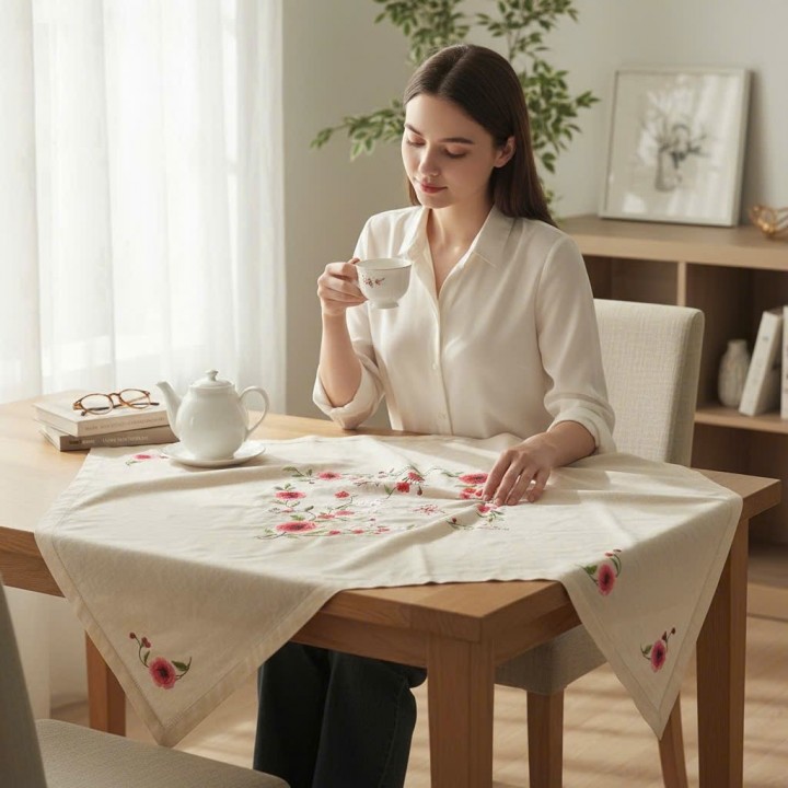 Square table cloth - Butterfly and flower embroidery(size 90 cm) (Beige cloth)
