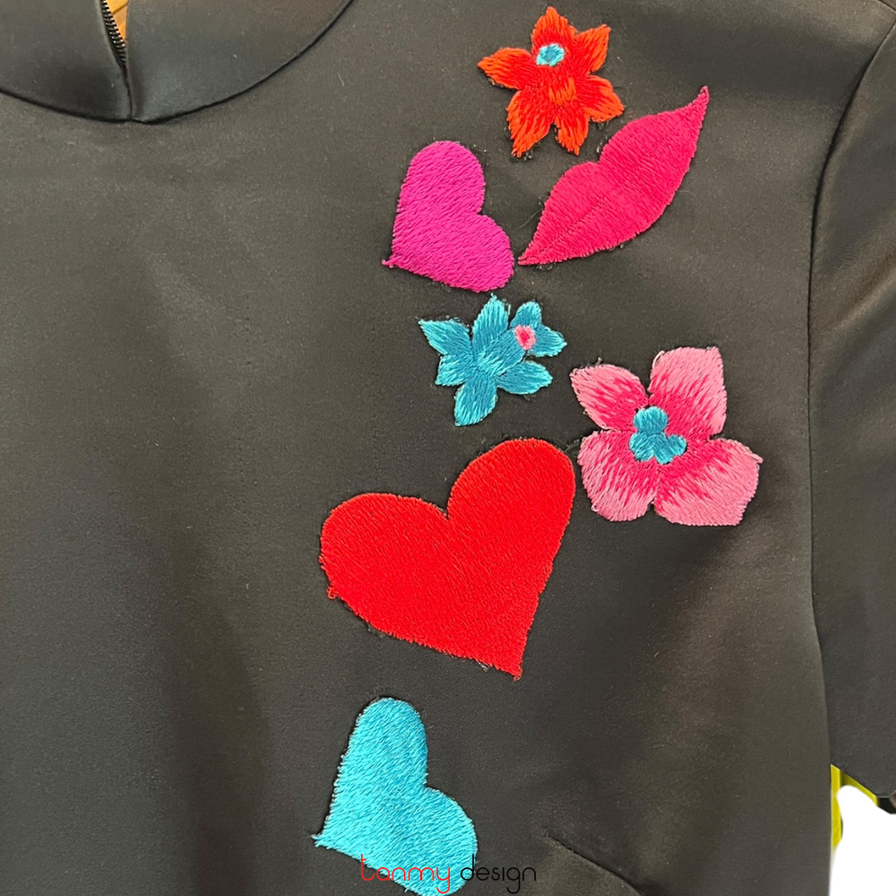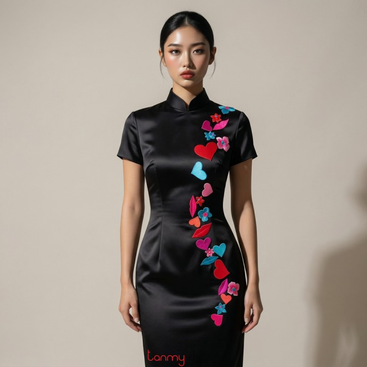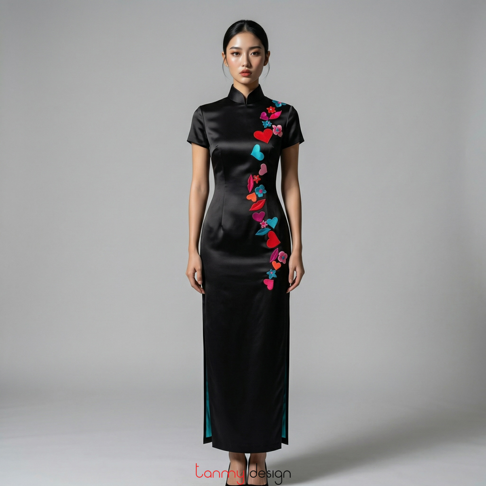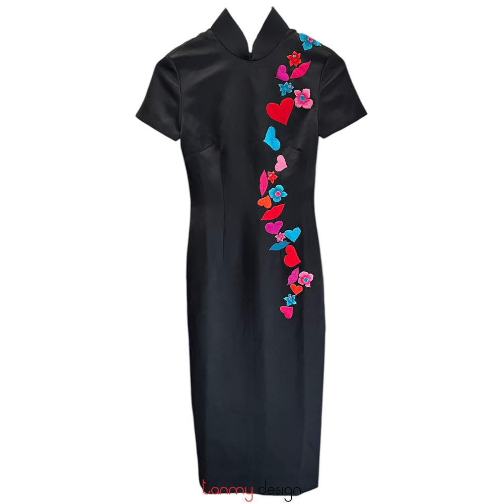 Short-sleeve qipao dress with a Mandarin collar, embroidered heart on black brocade