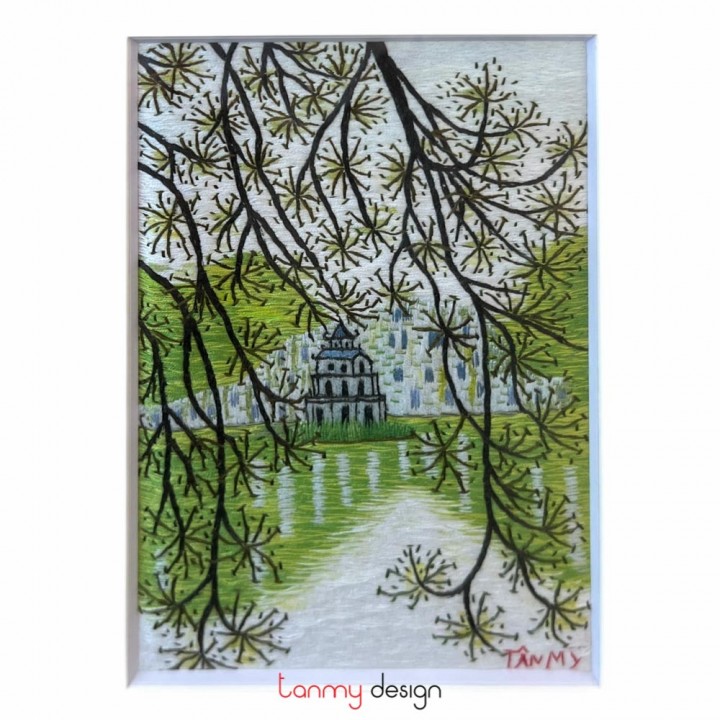 Hand-embroidered painting - Hoan Kiem Lake with brach of leaves (small size)