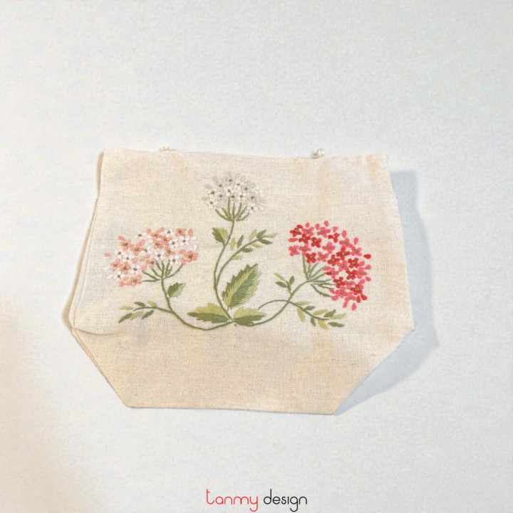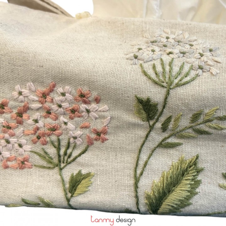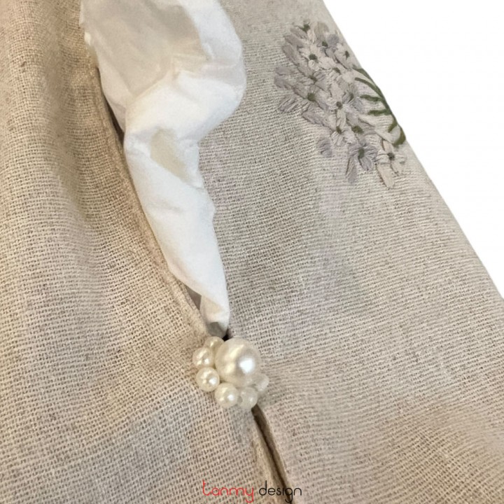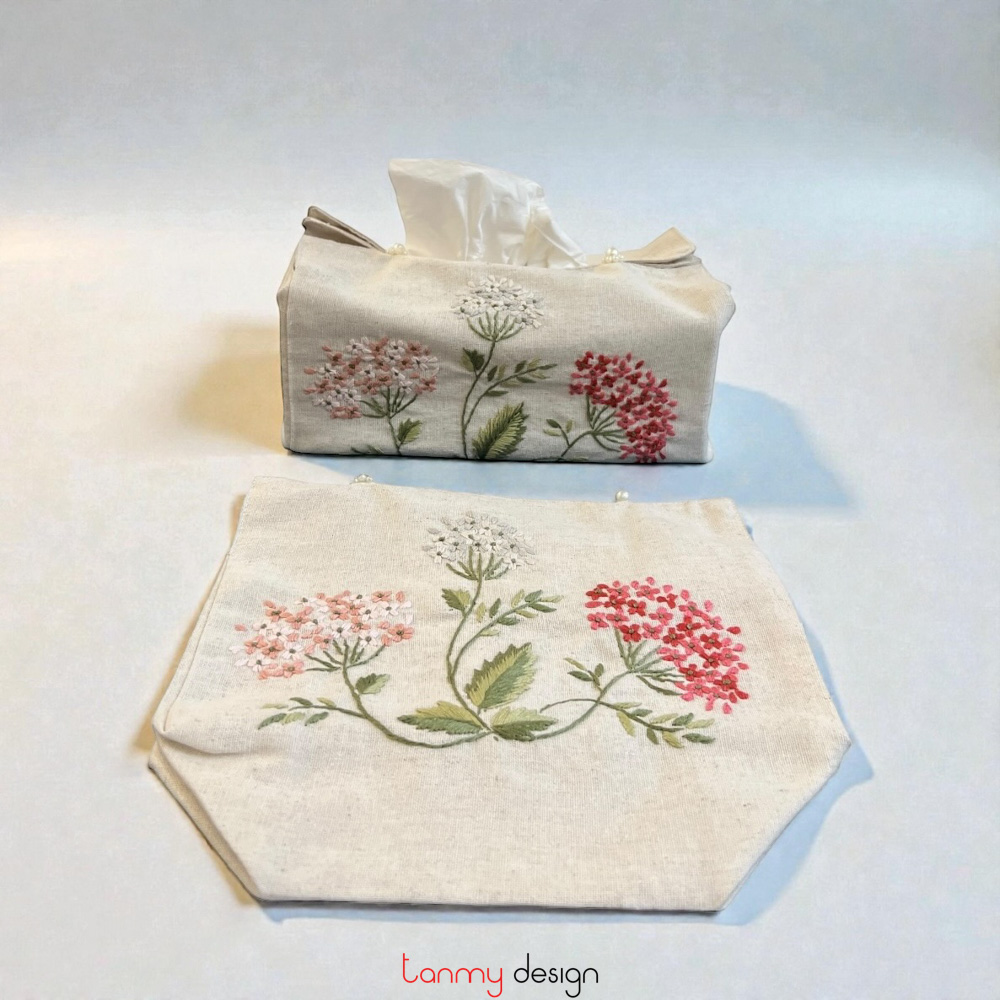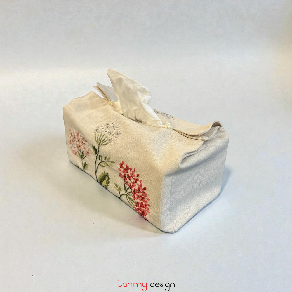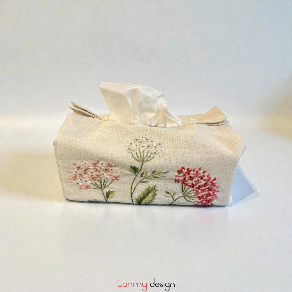 Beige tissue box cover embroidered with hydrangeas