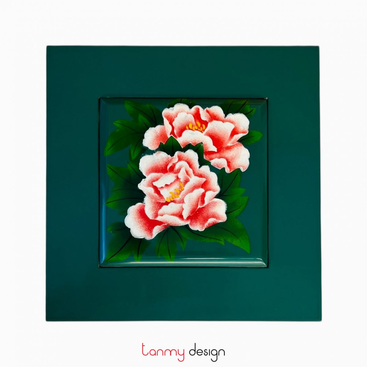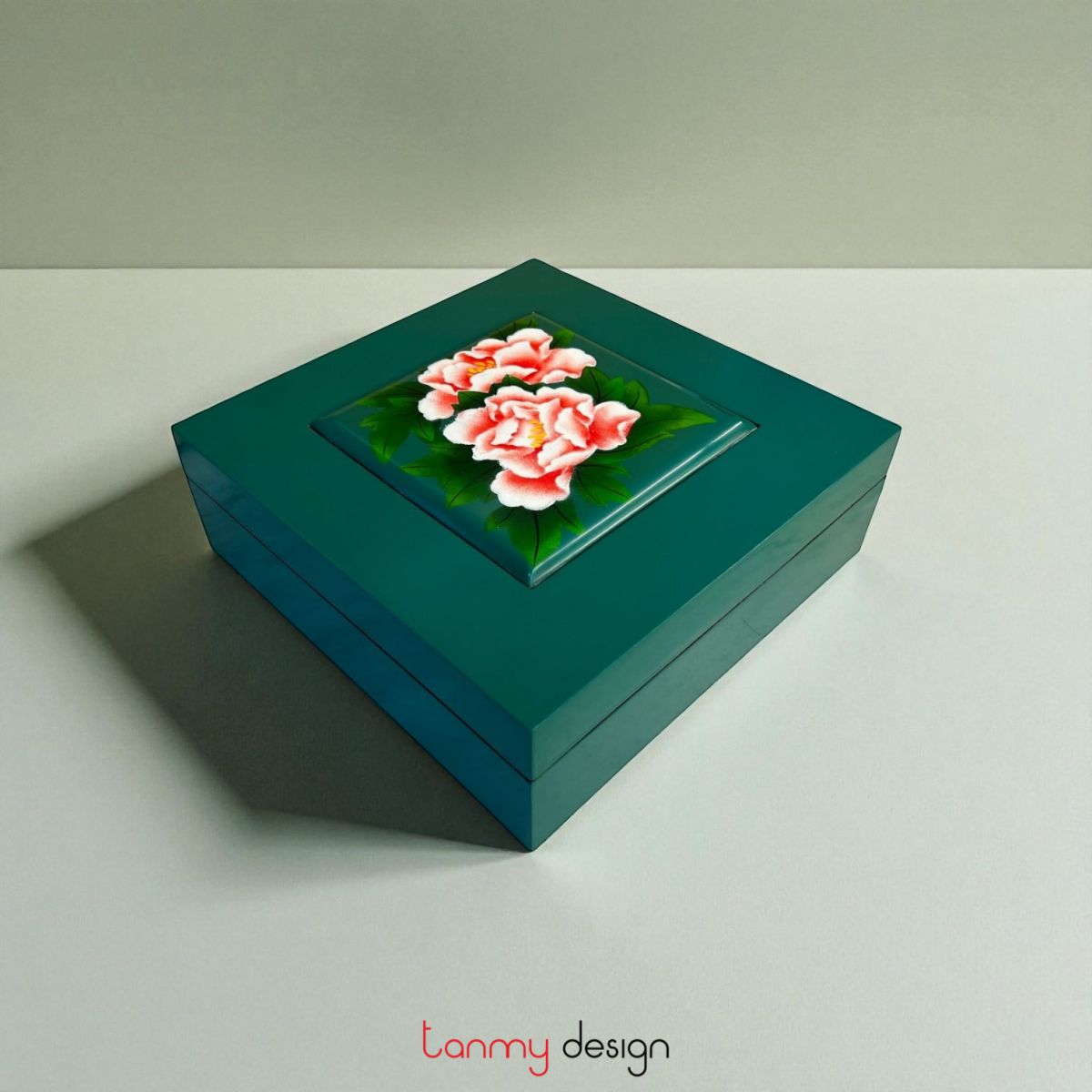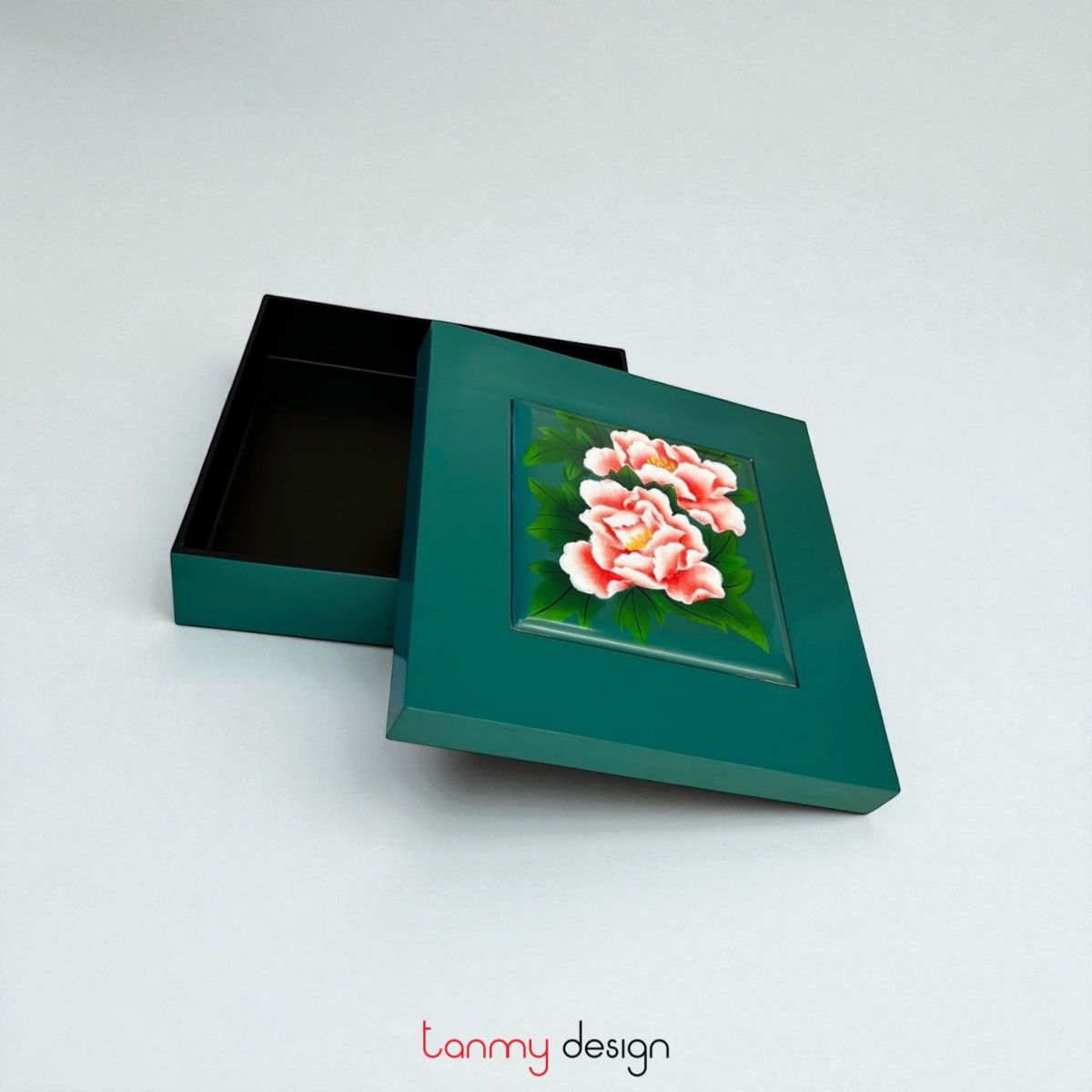 Hộp sơn mài vuông nắp lồi có ngăn vẽ hoa mẫu đơn 25 cm ( các màu )