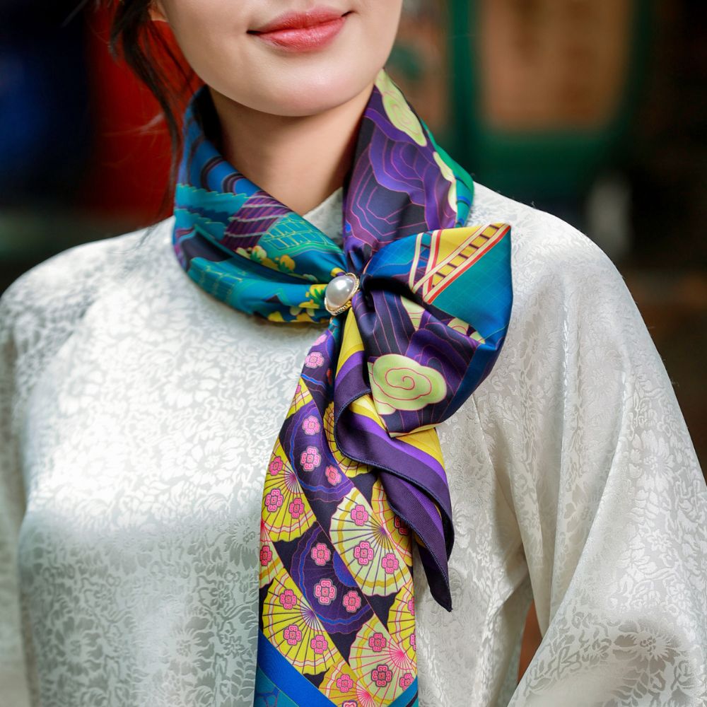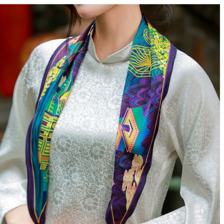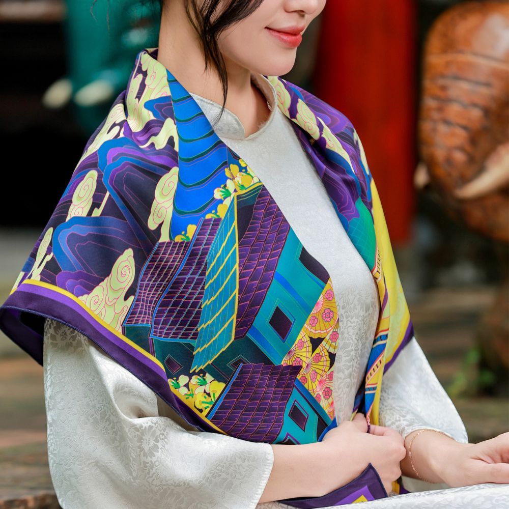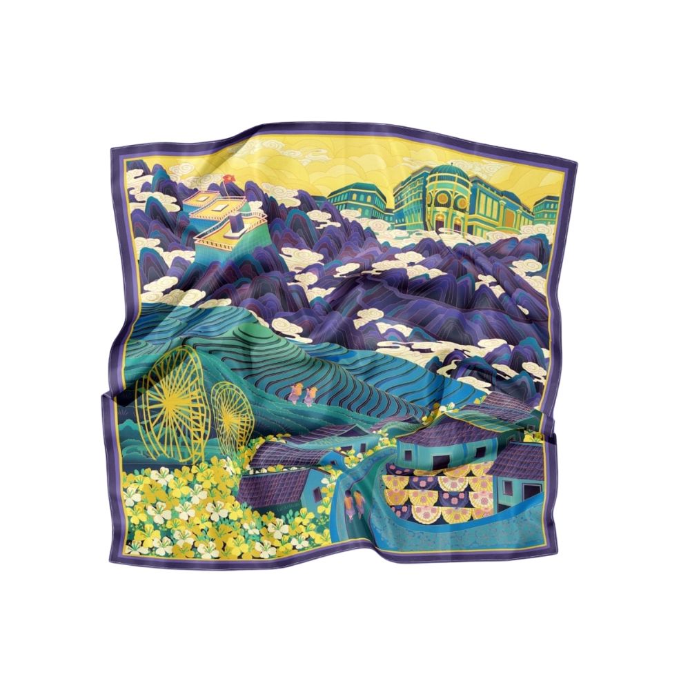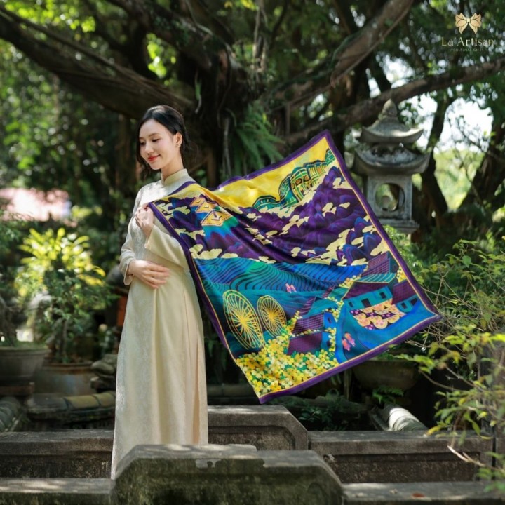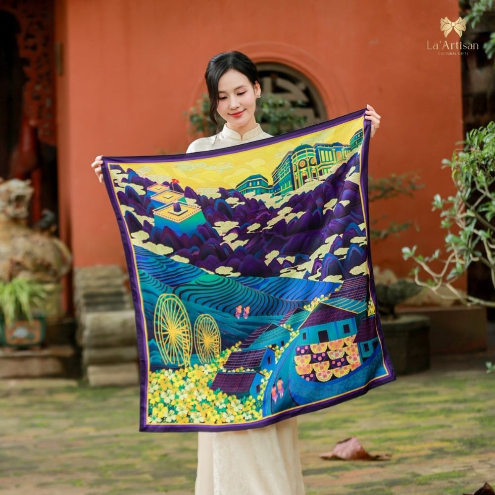 Lấy cảm hứng từ Sa Pa – vùng đất nơi thiên nhiên kỳ ảo hòa cùng bản sắc văn hóa và “chữ tình” của con người miền núi. Nơi đỉnh Phanxipăng chạm mây, hoa Đỗ Quyên nở rực giữa sương và cuộc sống lặng lẽ mà đầy yêu thương. Tất cả tạo nên chiếc khăn họa tiết Sapa, mang hơi thở núi rừng và tình người Tây Bắc.