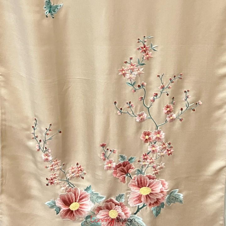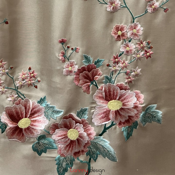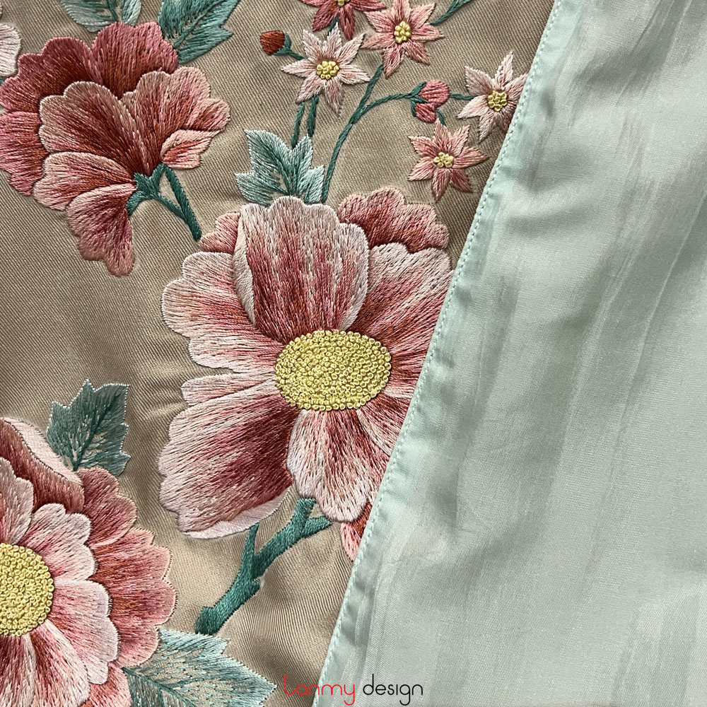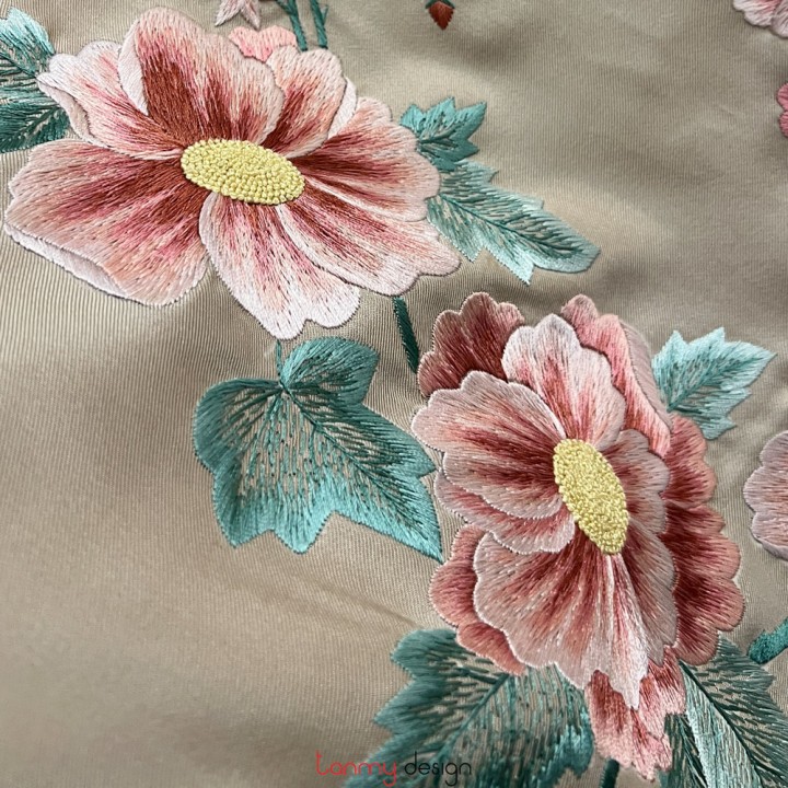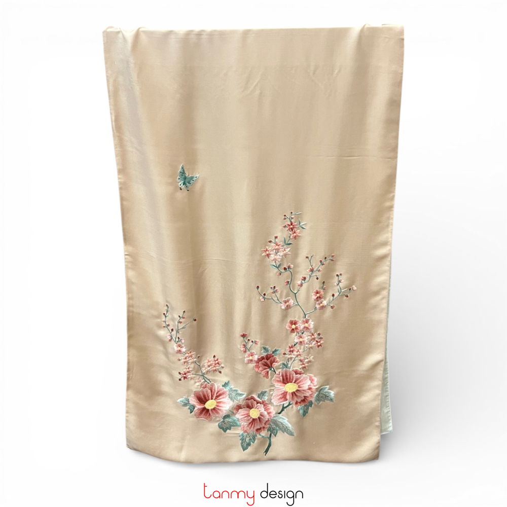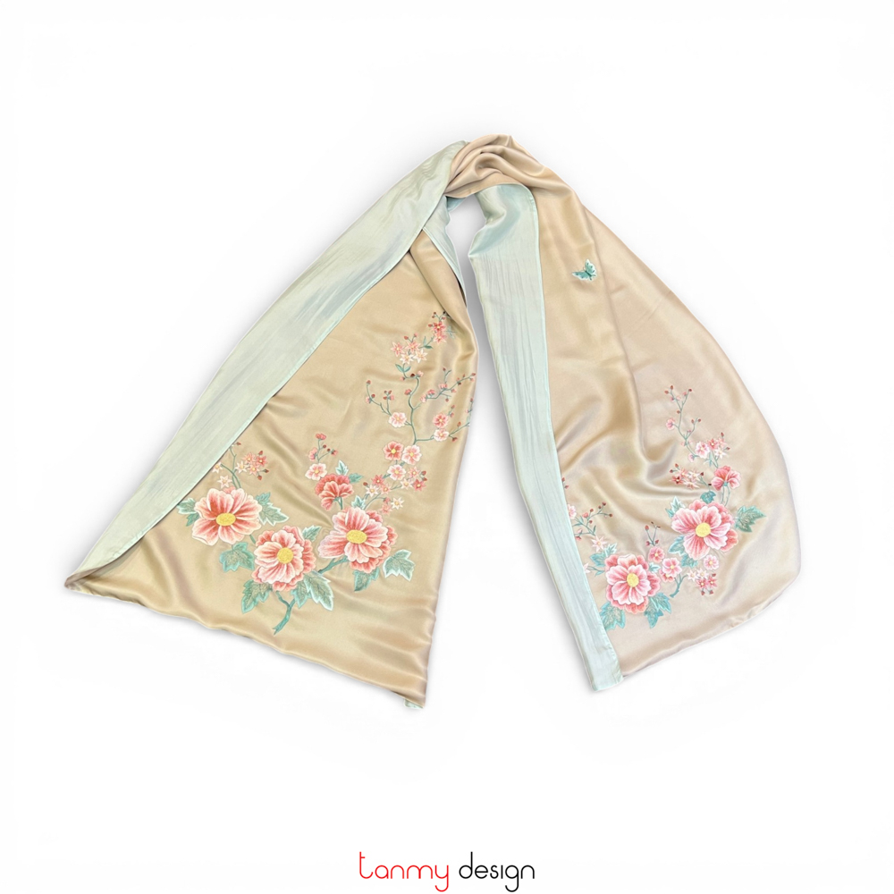 Khăn lụa 2 mặt kem thêu hoa và lá 55*200 cm