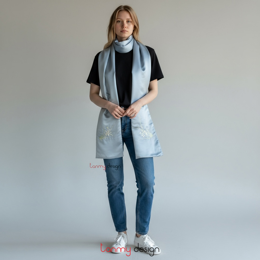 Khăn lụa 2 mặt xanh ghi thêu cỏ dại 25*200 cm