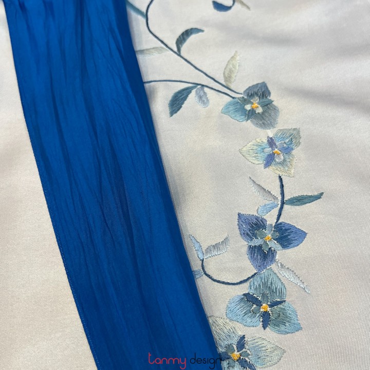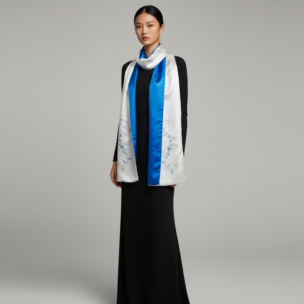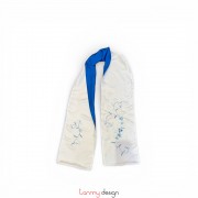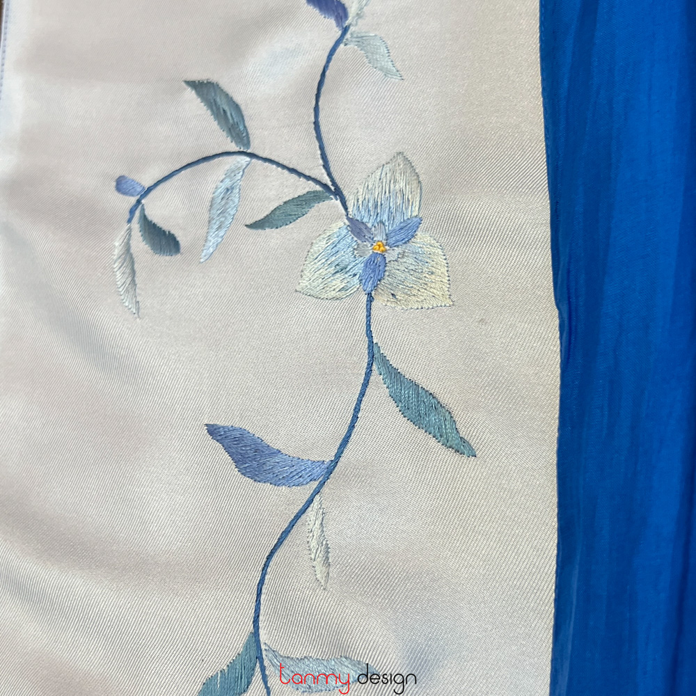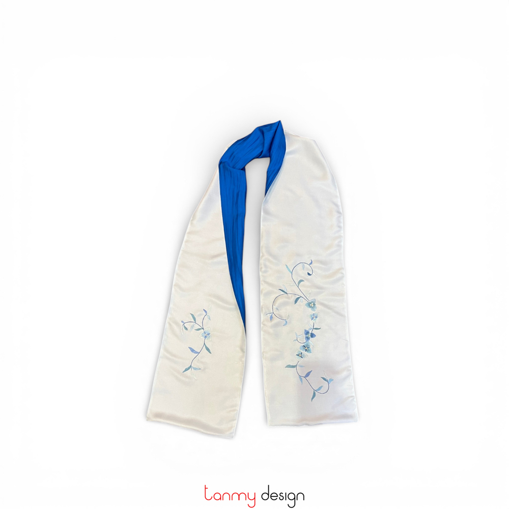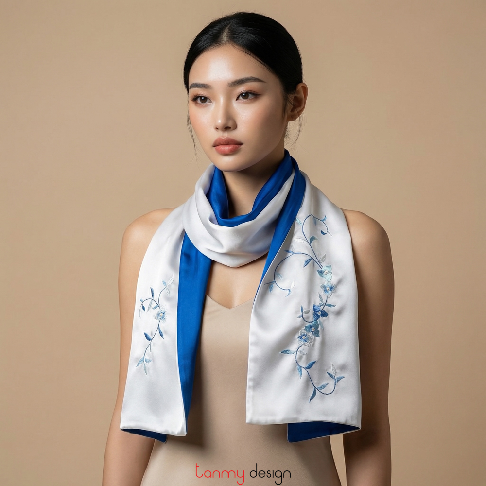 Khăn lụa 2 mặt xanh thêu hoa lá 25*200 cm- Mẫu 6
