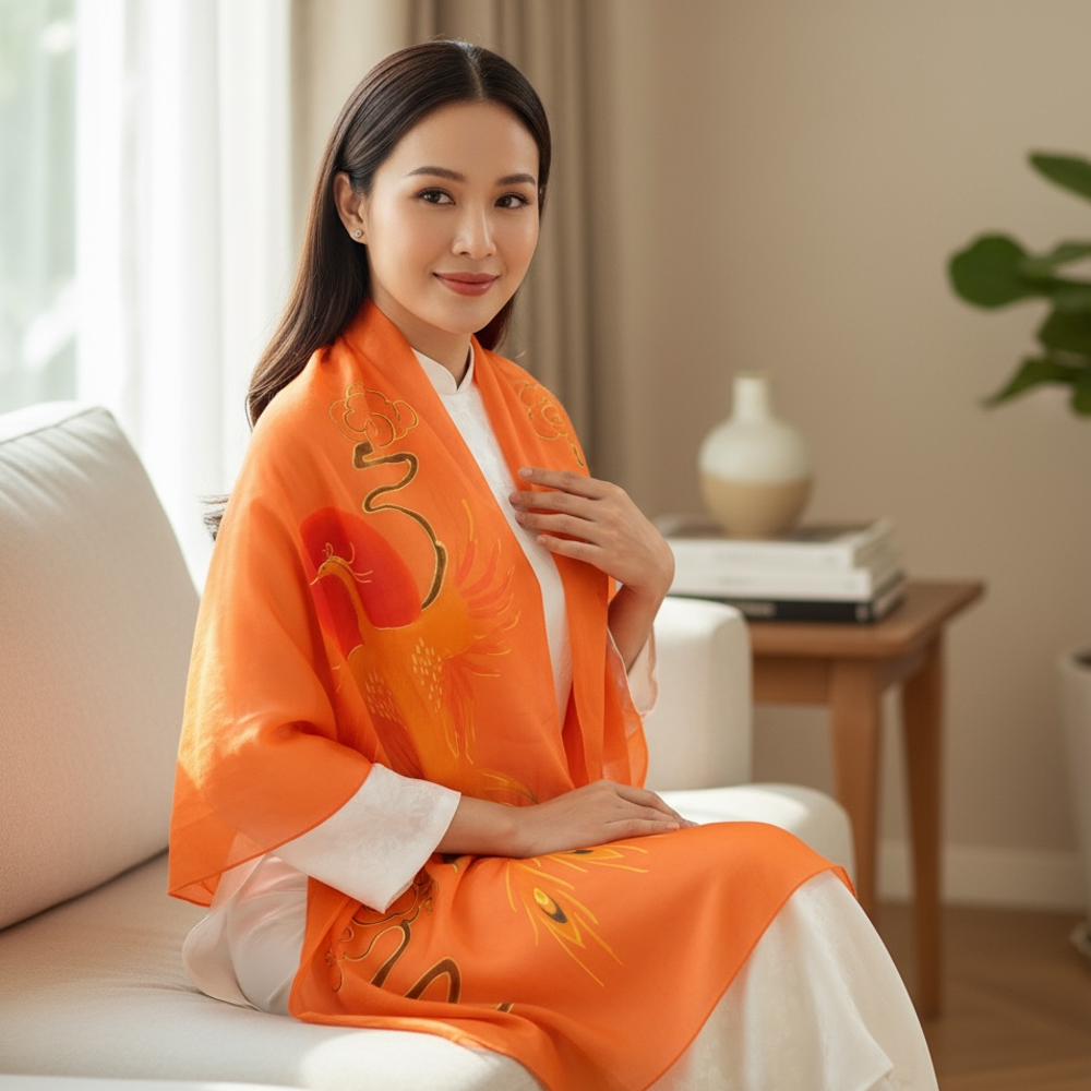 Khăn gai dài màu cam đậm vẽ tay hình tùng hạc 70*190cm