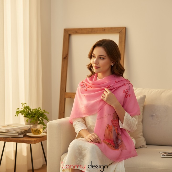 Khăn gai dài màu hồng sen vẽ tay hình phố cổ 70*190cm