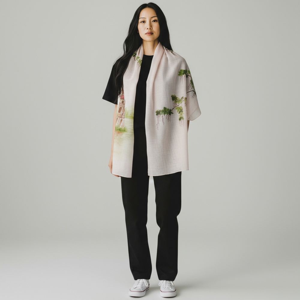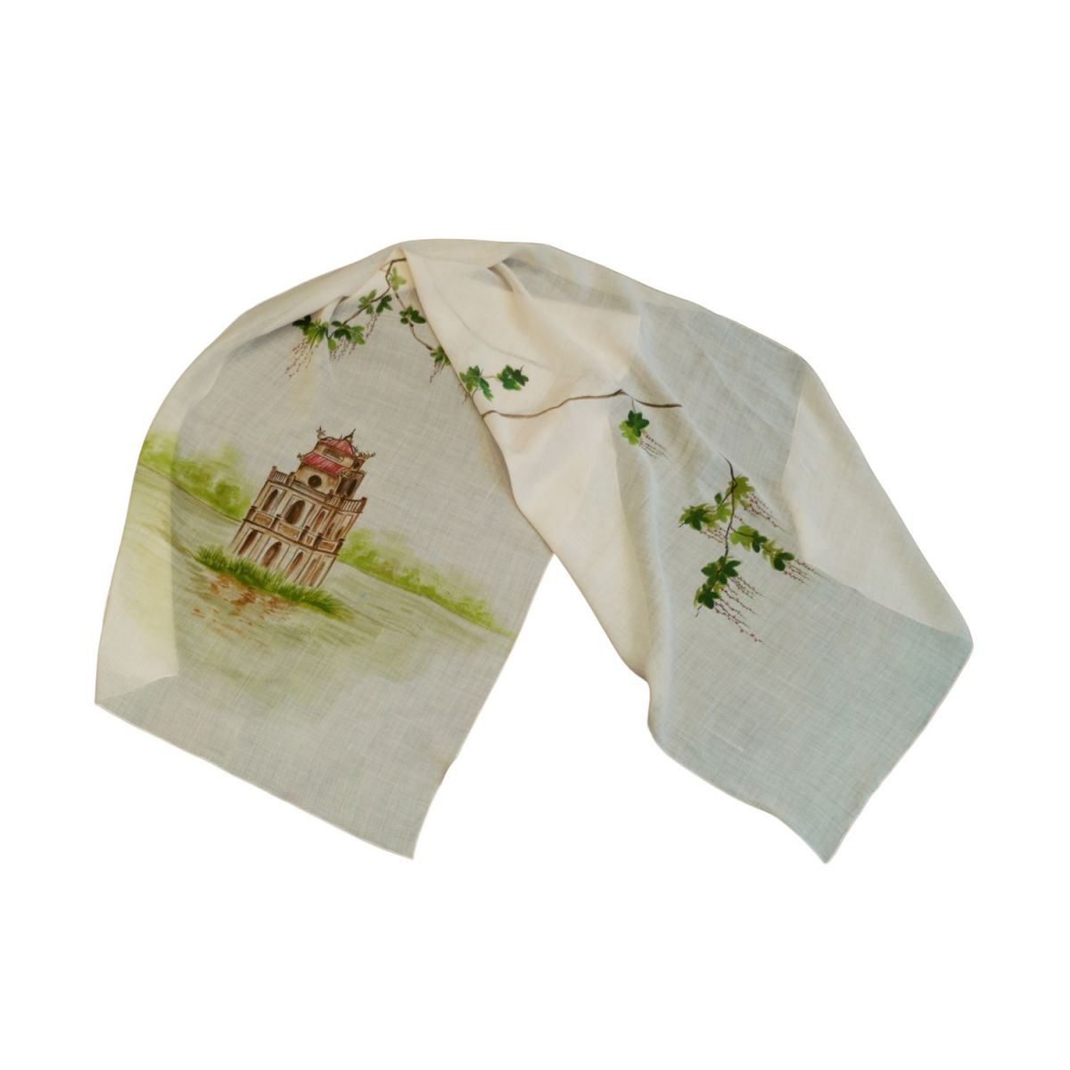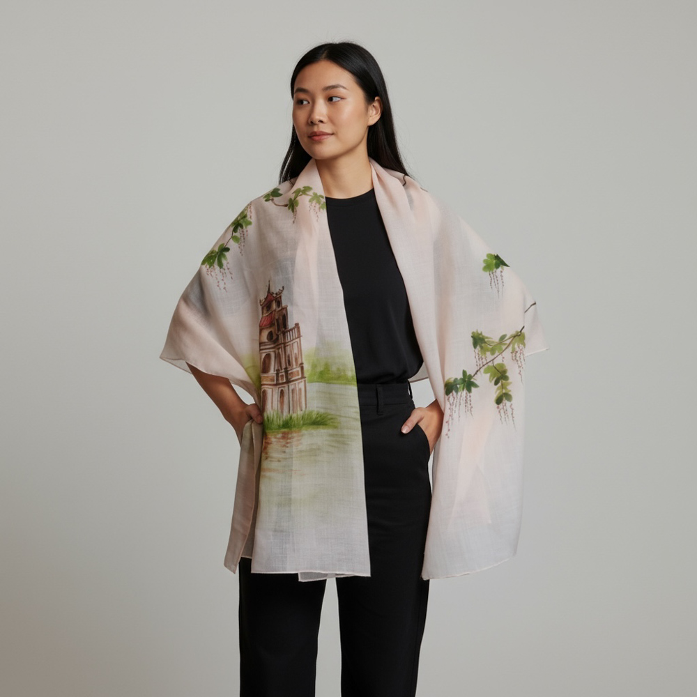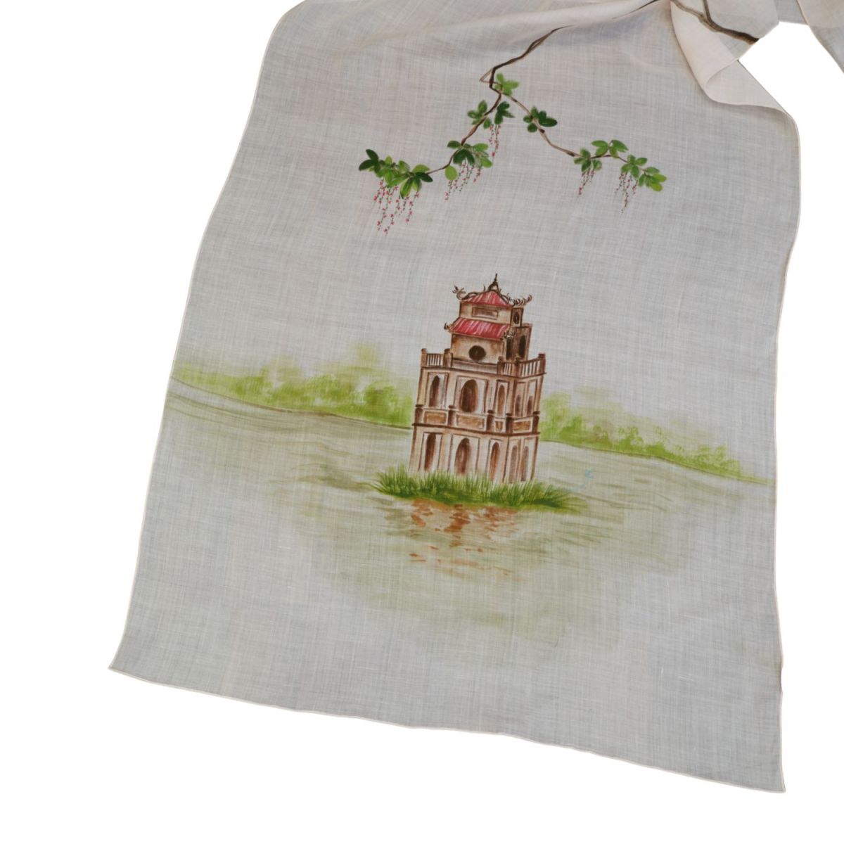 Khăn gai dài vẽ tay hình Hồ Gươm màu hồng nhạt 70*190cm