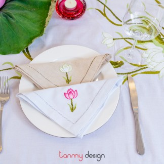 Rạng san hô màu cam, cành đào mimosa màu xanh trời nhạt, hoa cẩm tú cầu màu đỏ,... Tất cả hoạ tiết được thêu tay đều có màu sắc tươi sáng làm nổi bật chiếc khăn trải bàn màu trắng tinh khôi.